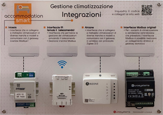 Uno dei punti di forza di Accommodation Smart è la flessibilità di integrazione. Il sistema è in grado di interfacciarsi con qualsiasi impianto di riscaldamento e climatizzazione esistente, grazie a interfacce specifiche selezionate dai tecnici Eurosystems già in fase di offerta. Questo significa che non è necessario sostituire l’infrastruttura impiantistica già presente nella struttura.