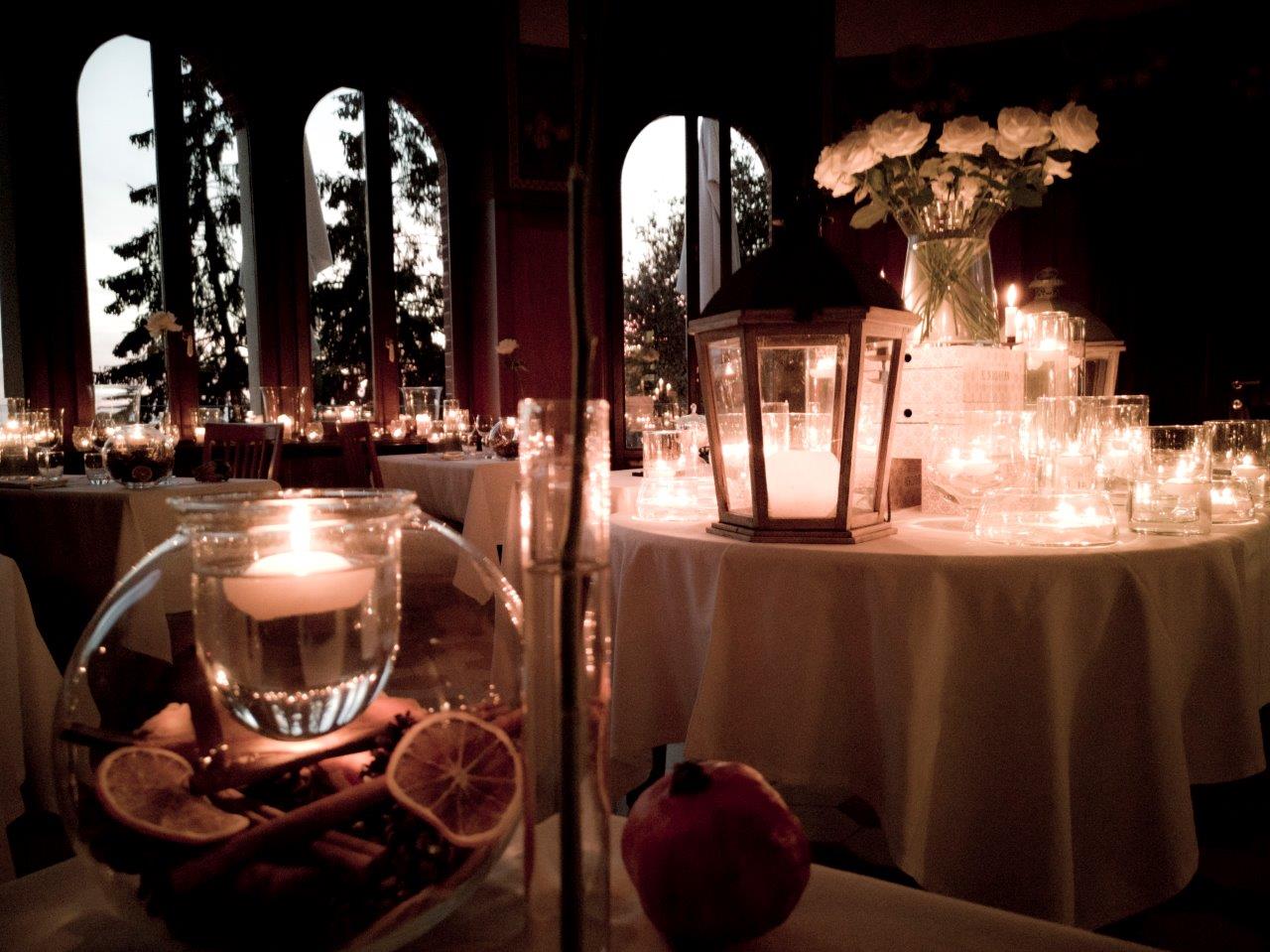 Alle cene a lume di candela è destinata la sala da pranzo circolare rivestita di boiserie, con vista sul tramonto e, una volta calato il sole, sulle mille luci della pianura. All’interno, tavoli addobbati da rose bianche e decine e decine di candele – non c’è nemmeno una lampadina accesa – creano un’atmosfera speciale.