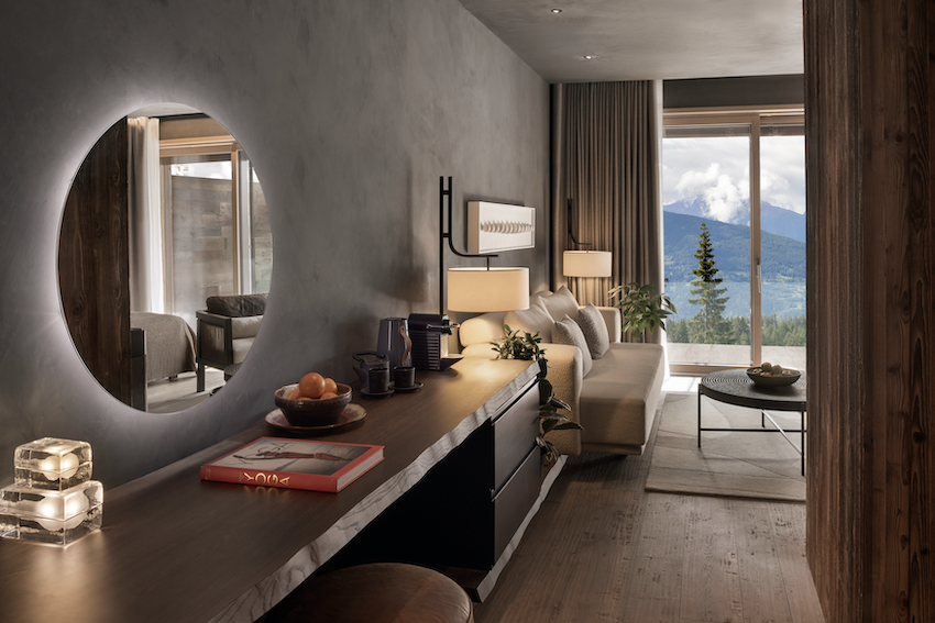 L’esperienza dell’ospite dell’hotel comincia ‘immergendosi’ nella montagna, ovvero percorrendo il tunnel d’ingresso dell’hotel in cui lo spazio rivestito in pietra, illuminato in modo puntuale, rimanda all’interno di una grotta. Anche il soffitto rimanda al paesaggio circostante; è costruito in legno, e tra i pannelli filtra la luce, creando giochi di luce che rimandano ai cammini nel bosco.