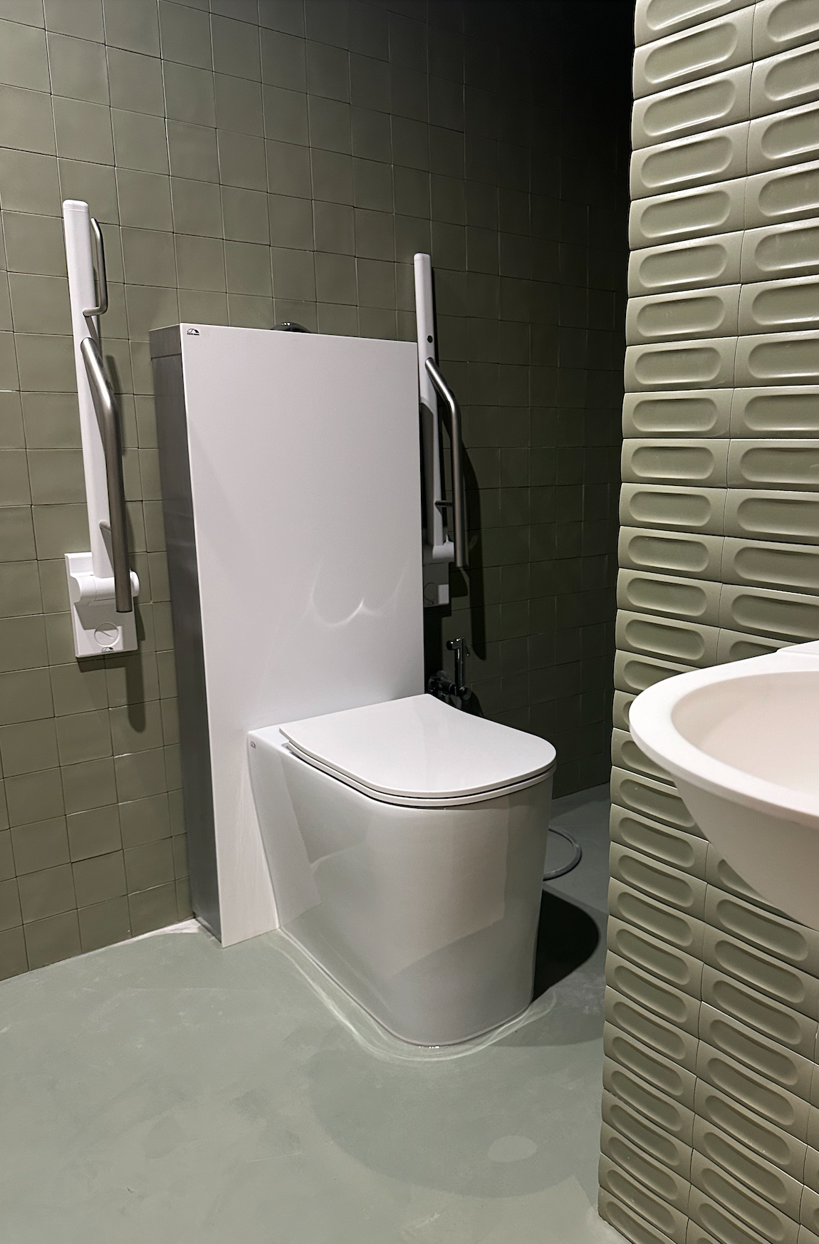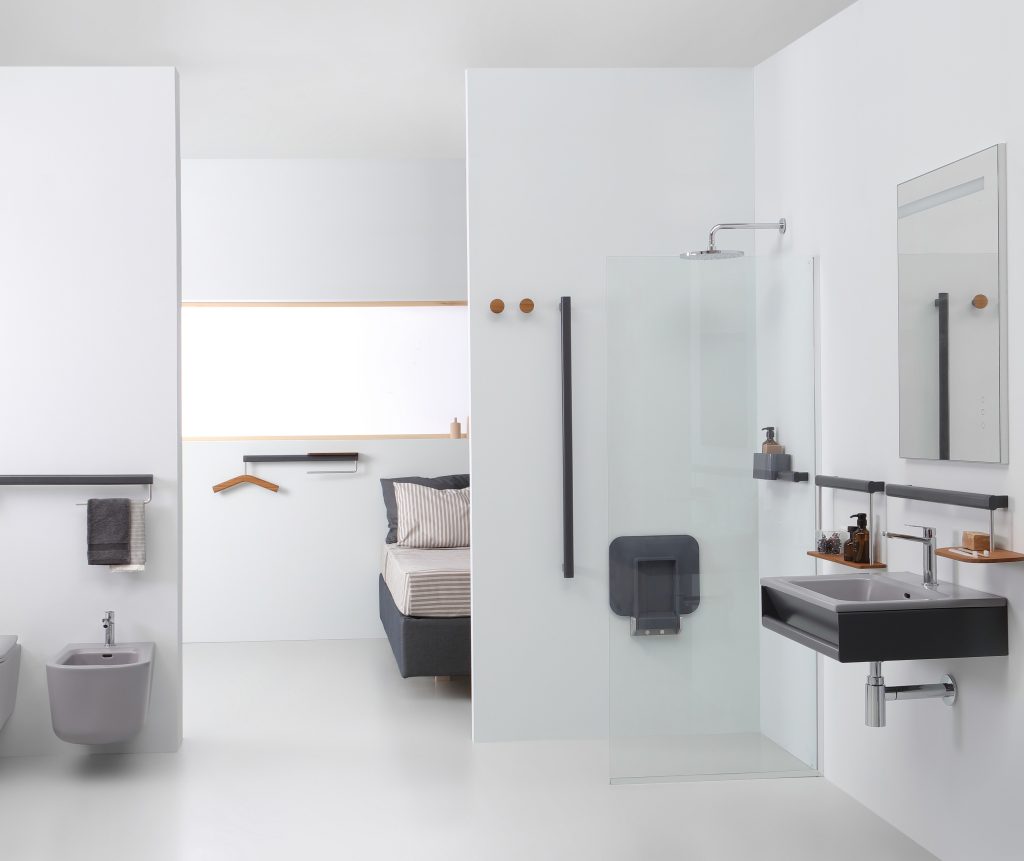 Omnia si inserisce perfettamente all’interno di questo contesto grazie ai suoi elementi caratterizzati da un design accessibile: maniglie di sicurezza accessoriate, sedute, mobili contenitori, lavabo, sanitari e specchi che possono integrare sistemi di igienizzazione dell’aria e richiesta di aiuto.