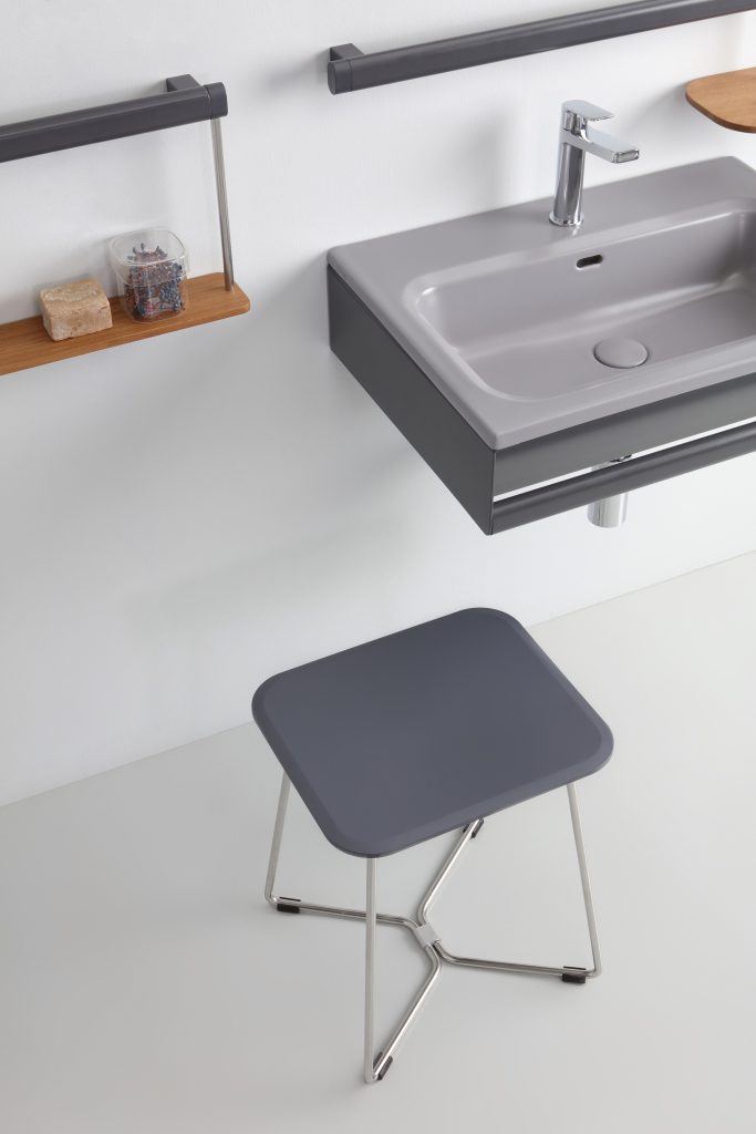 L’offerta delle sedute si sviluppa con sgabelli, sedili doccia a ribalta, di cui uno dotato di piede d’appoggio a terra e uno rimovibile. Si tratta di elementi semplici ed eleganti, caratterizzati dagli angoli stondati ideali per facilitare i movimenti, specialmente all’interno della doccia. Tutte le sedute sono testate per garantire carichi fino a 150 chilogrammi, grazie al sistema di ancoraggio a parete in allumino e alla struttura interna in acciaio. Lo sgabello ha le “gambe” in tondino di acciaio inossidabile, un materiale che richiama gli accessori delle maniglie.
