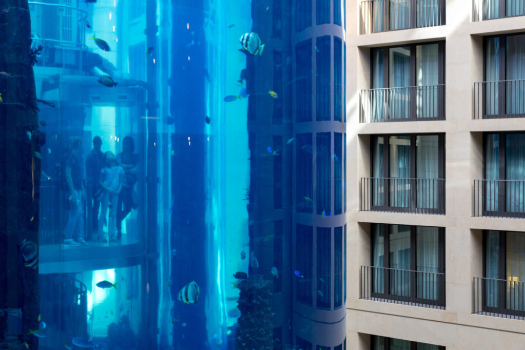 La ristrutturazione ha riguardato la riprogettazione di tutte le camere – 427 camere e suite disposte su sei piani -, di un nuovo spazio di reception, della hall, del bar e dei ristoranti. Fulcro dell’hotel è l’AquaDom, il più grande acquario del mondo dalla forma cilindrica, che con i suoi 1.600 pesci tropicali rappresenta una grandissima soluzione scenografica ed è stato anch’esso oggetto di una importante opera di modernizzazione.