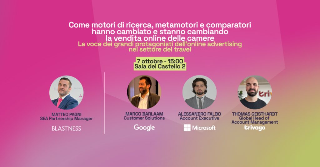 Il secondo intervento approfondisce il tema dell’advertising online nel settore travel, con un’analisi dell’evoluzione della distribuzione digitale e dei cambiamenti che l’AI ha introdotto nel settore e insights utili per affrontare al meglio le sfide future. “Come i motori di ricerca, metamotori e comparatori hanno cambiato e stanno cambiando la vendita online di camere” alle ore 15:00, sarà moderato da Matteo Pagni, SEA Partnership Manager, in dialogo con Marco Barlaam (Google Customer Solutions), Alessandro Falbo (Account Manager Microsoft) e Thomas Geisthardt (Global Head of Account Management Trivago).