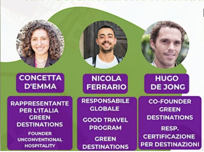 In occasione della presentazione streaming, Concetta D’Emma, prima rappresentante per l’Italia di Green Destinations e Nicola Ferrario, responsabile globale Good Travel Program di Green Destinations, illustreranno i criteri per la preselezione per le prime realtà turistiche italiane di tutta la filiera da inserire nel primo percorso di certificazione in formato challenge: sarà presente anche Hugo De Jong, co-fondatore di Green Destinations e Responsabile per la Certificazione delle Destinazioni.