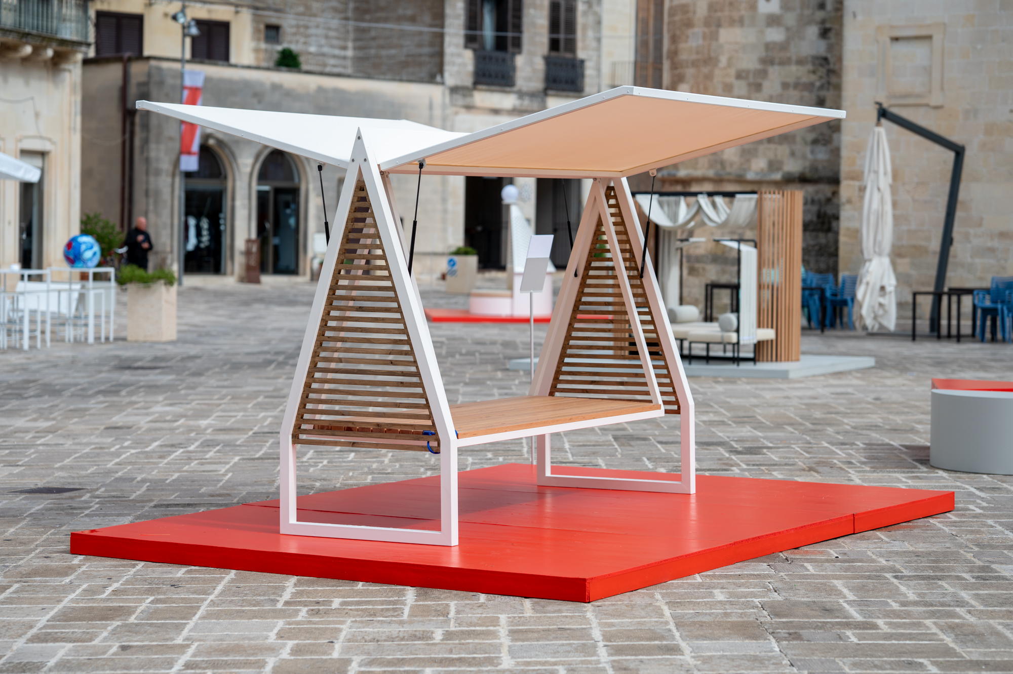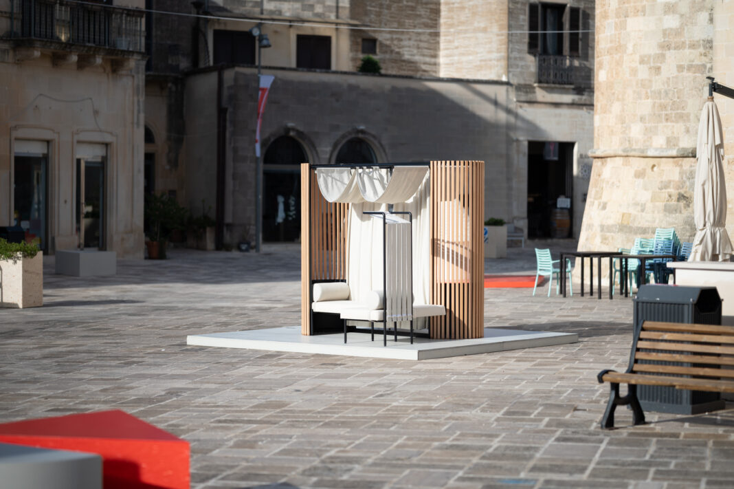 L’esposizione dei quattro prototipi chiude idealmente il cerchio che descrive sia il festival che la filosofia di Sprech: la riflessione che getta le basi per il progetto, il progetto che prende forma e si misura con la tecnologia per dare vita al prototipo, l’entrata in produzione del prodotto. E la mostra rappresenta anche il filo di collegamento tra le varie edizioni del festival, perché nell’edizione 2025 sono stati esposti i prototipi dei vincitori della sezione Garden del concorso dell’edizione 2023 dal tema “Iperlocale: architettura e design dai territori”, pronti a entrare nel catalogo dell’azienda, la family company specializzata in soluzioni outdoor – coperture modulari, pergole, gazebo, dehors, tensostrutture – destinate a un utilizzo commerciale o residenziale. I prototipi che hanno arredato le piazze sono stati l’amaca Felicità di Samuel David Silva Batista, la seduta Trullight di Sissy Daniele, i daybed Esse di Antonio Giovanni Calone e MoonGlow di Silvia Orlandi.