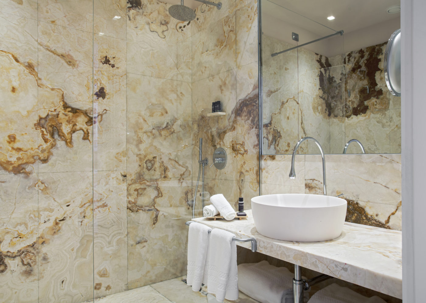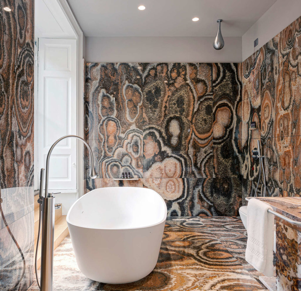 Gli ambienti arredati con i materiali Antolini si animano in un gioco infinito di luci, venature, colori, forme e contrasti che la pietra naturale svela quando è sapientemente lavorata, posata, illuminata. A partire dalle sale da bagno, i cui rivestimenti spaziano dalle sfumature candide del Bianco Lasa | Covelano Fantastico, al nero con accenti bianchi del Black Horse, dai colori terra fuoco del Breche Meduse, alle cromie cielo/mare del bagno rivestito con il marmo Calcite Azul Extra. Mentre i bagni in Fusion Wow Original Dark, Light e Multicolor, Pietra Viva, Onice Miele, Onix Mon Amour raccontano la misteriosa storia della terra, con venature e striature evocative di antichi movimenti delle masse rocciose nel sottosuolo. La bellezza delle superfici Antolini – resistenti e dal potente effetto decorativo – si ritrova anche nei numerosi complementi d’arredo, come tavoli e tavolini, presenti nelle stanze e negli spazi comuni e che proseguono quel percorso artistico messo in scena dalle sue pietre naturali, così come l’audacia progettuale voluta da VIK Retreats per l’hotel.