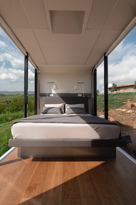 La struttura è completamente autonoma grazie ai pannelli solari collocati sul tetto, e realizzata con materiali Made in Italy ed ecosostenibili: dalla struttura esterna in policarbonato alla fibra di vetro riciclata, dall’ecopelle alle fibre naturali degli arredi, per finire con i tessuti purificanti, un materiale nuovo pensato per ridurre l’inquinamento ambientale. Anche le finiture degli arredi sono costruite con materiale di scarto proveniente dalla lavorazione dell’uva, mentre il controsoffitto è rivestito da un particolare tessuto in grado di purificare l’aria.