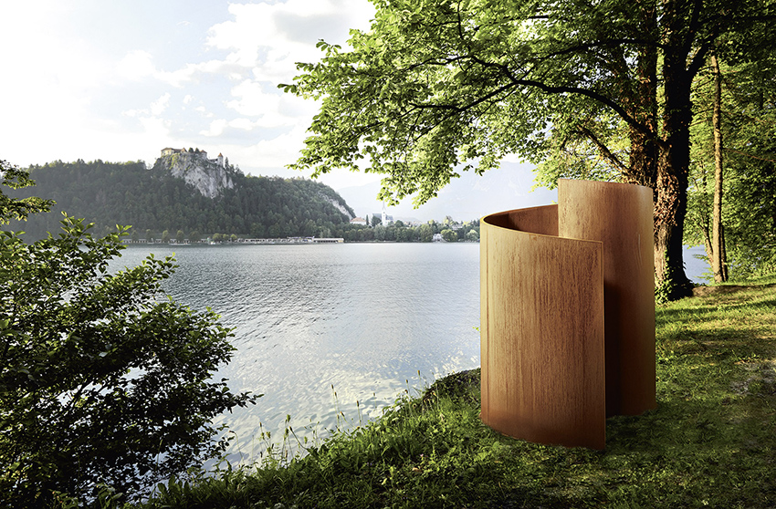 Docciart in acciaio corten in riva a un lago