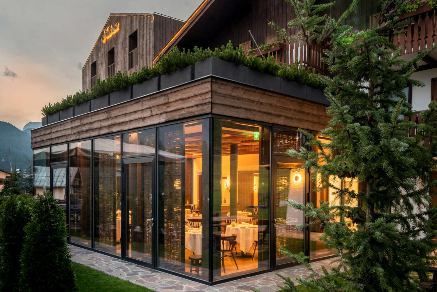 Il progetto di ristrutturazione e di ampliamento dell’hotel, avviato nel 2019 dallo Studio Flaviano Capriotti Architetti con la realizzazione di un nuovo corpo centrale, camere e spazi comuni, trae ispirazione dal contesto e dai suoi riferimenti culturali, ma esprime un linguaggio contemporaneo fatto di linee nette e geometrie pure esaltate dal sapiente uso della materia. Gli ambienti comuni e le stanze dell’hotel (in tutto 52 camere a cui si aggiungono le nuove suite), mettono in evidenza dettagli sofisticati, ottenuti grazie al saper fare delle maestranze presenti nel territorio ma reinterpretati in chiave moderna. Il legno è protagonista assoluto degli ambienti interni, ma tutti i materiali scelti sono quelli tipici dell’architettura locale: la pietra dolomia, il larice spazzolato, gli imbottiti in panno di lana, le maioliche color blu-verde a ricordare il colore dei laghi alpini. Un mix di texture, cromie e superfici che esprimono eccellenza e al contempo trasmettono agli ospiti una sensazione di profonda bellezza.