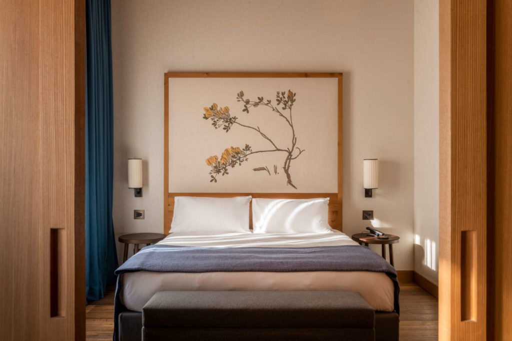 I materiali sono preziosi, i dettagli ricercati, il parquet, le boiserie e i soffitti storici in larice sono stati recuperati integrandoli in nuove pareti con elementi in legno di quercia tinto carbone e in tessuto color avorio. Ma anche le testate dei letti in lana imbottita con disegni della botanica classica della flora alpina che rimandano all’idea di accoglienza che da sempre è nel dna di questo territorio. La flessibilità e la connessione degli spazi permettono di soddisfare le esigenze di chi è alla ricerca di spazi di maggiori dimensioni e privacy: comunicanti tra loro, le suite possono anche essere unite per configurare un’unità di oltre 250 metri quadrati.