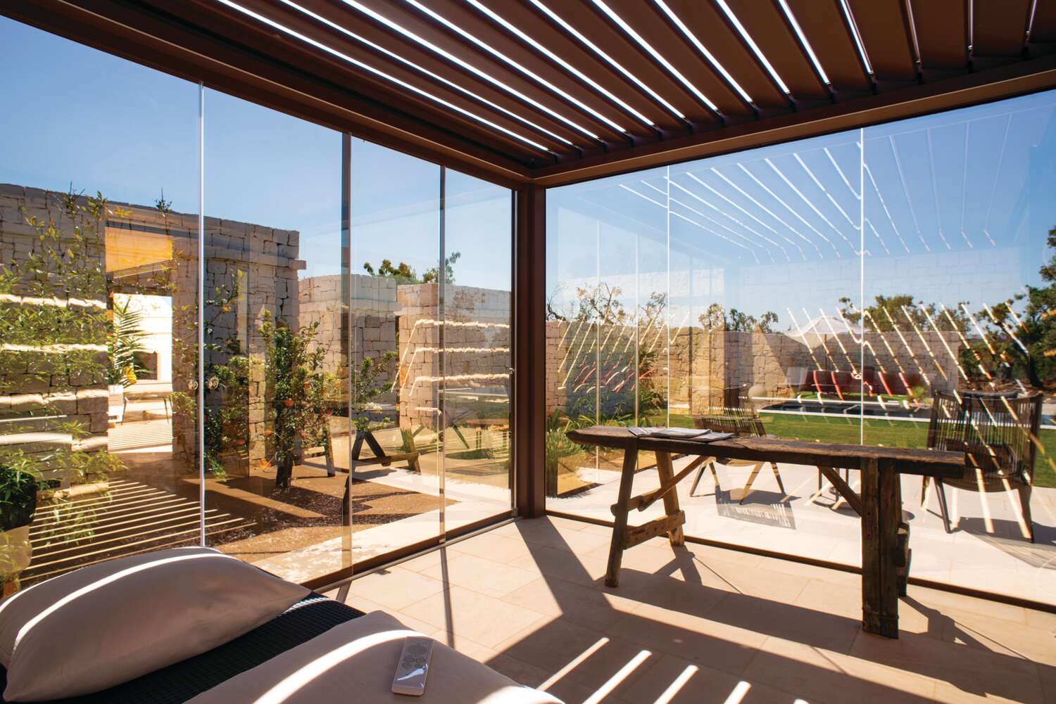 Di giorno, le vetrate Spy Glass riflettono il paesaggio sulla propria superficie, rendendo il contenuto della pergola impenetrabile a uno sguardo esterno. Nell’ambito del trullo, Connect abbina alla raffinatezza del manufatto storico un’architettura avveniristica e al contempo discreta, sulla quale il territorio si specchia e si trasforma in diretta, esaltando la bellezza dello scenario. L’unico tratto che rivela la presenza di Connect è infatti il suo profilo sottile in alluminio, dai toni corten che richiamano la terra rossa della Puglia. La stessa tonalità caratterizza anche le lame della copertura che, orientabili da zero a 140 gradi, garantiscono il comfort climatico e regolano illuminazione e ventilazione naturali. L’ultimo tocco di comfort e stile è infine offerto dalle tende verticali Raso, contenute nei profili orizzontali di Connect, e dai Led Line dimmerabili posizionati anch’essi lungo il perimetro della copertura che, alla sera, si riflettono nello specchio della piscina creando uno scenografico gioco di luci.