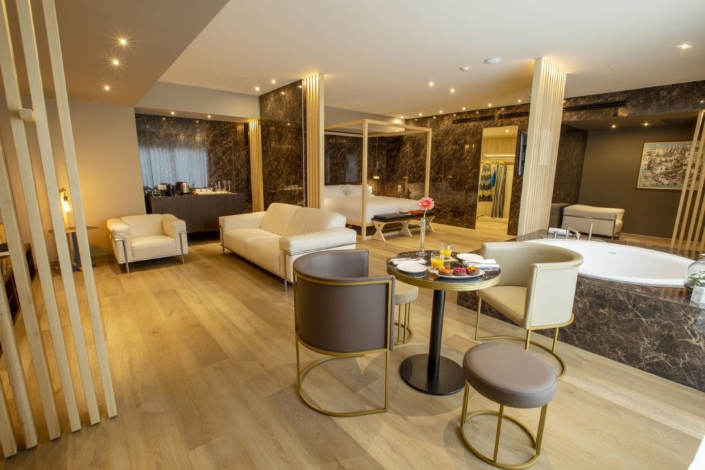 Tra le dotazioni, il centro benessere e fitness “Olos Spa” con una piscina esterna, vasca relax con angolo idromassaggio, sauna finlandese, bagno turco, percorso di 7 docce emozionali e un angolo tisane con vista sulla cascata e il laghetto.