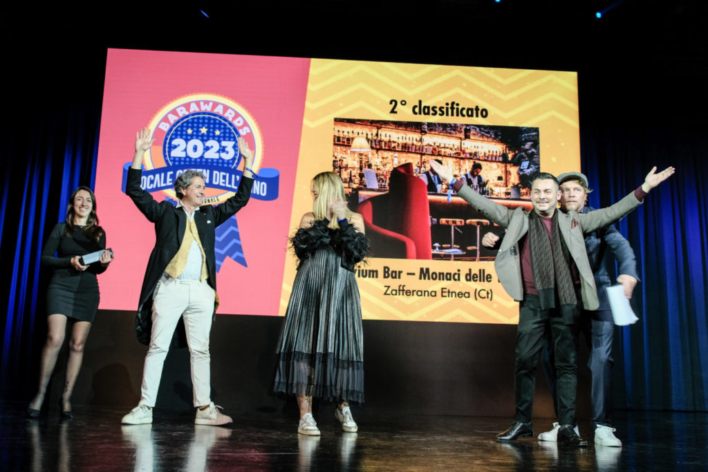 Nella foto, a sinistra, Guido Coffa sul palco durante la premiazione del locale nel corso della serata di gala di Barawards, organizzata all’Alcatraz di Milano.