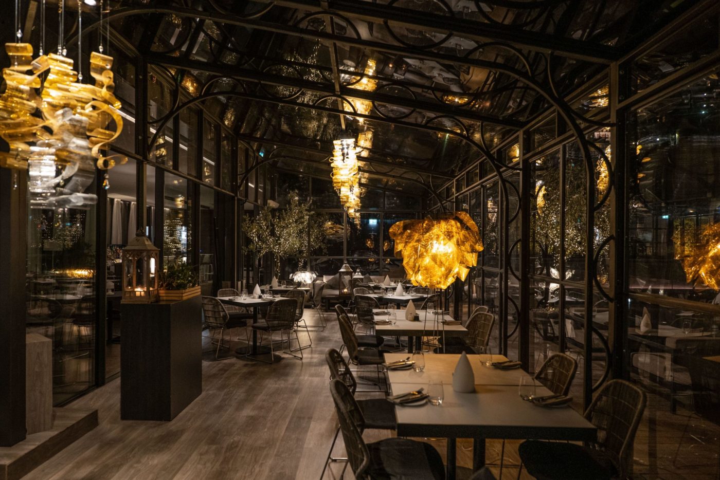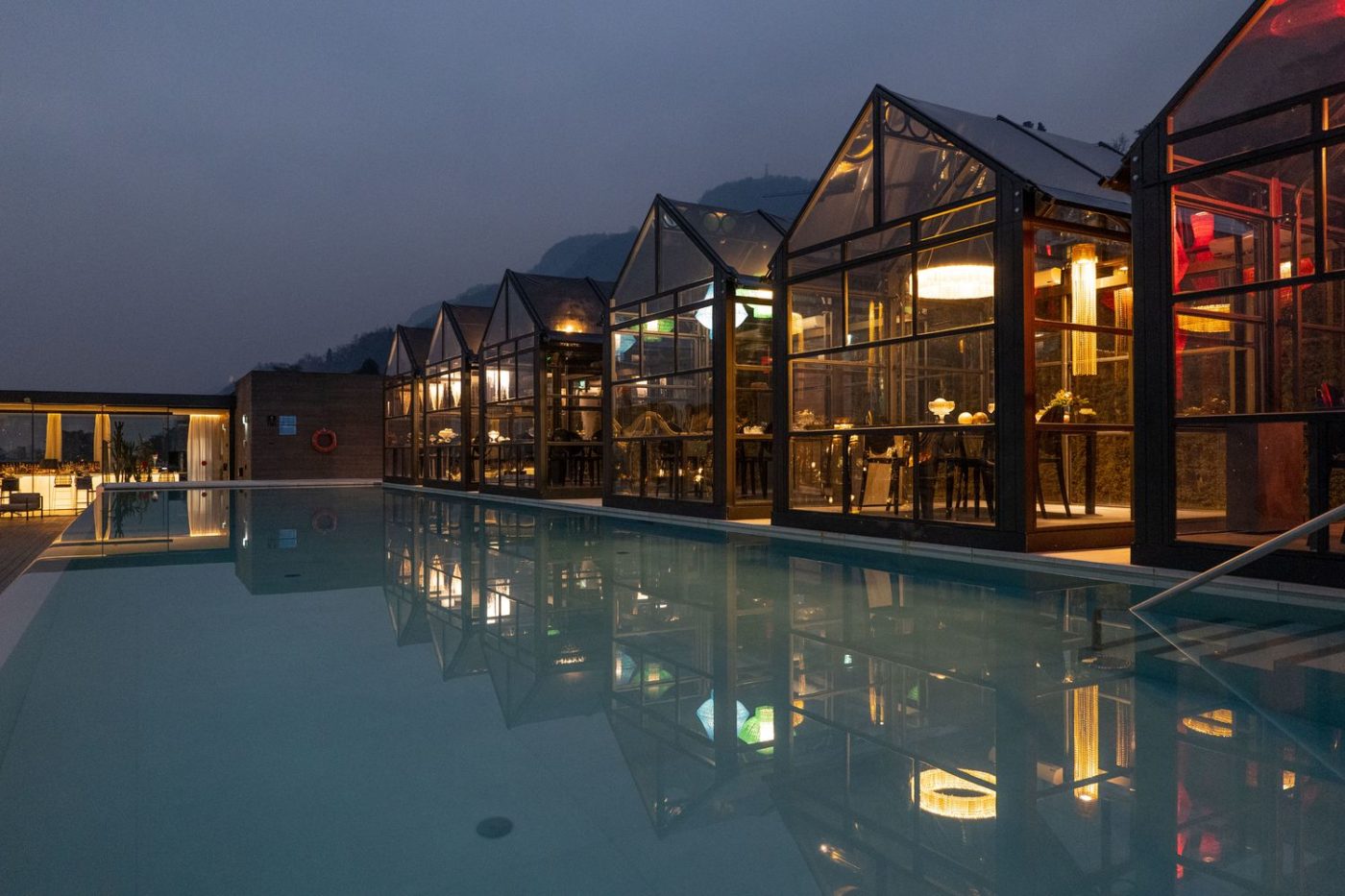 Le sei mini-serre, una diversa dall’altra, e una più grande ad unica campata, realizzate nel rooftop e affacciate sulla piscina a sfioro con vista lago, ampliano l’offerta dell’hotel di 100 posti a sedere al coperto in aggiunta ai 40 già disponibili. Le pareti trasparenti filtrano e riflettono la luce del giorno e del tramonto, lasciando libera la vista del contesto naturalistico in cui la Terrazza è inserita