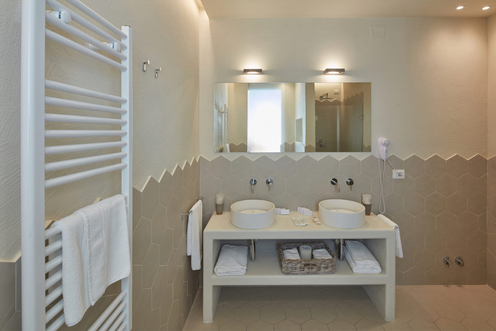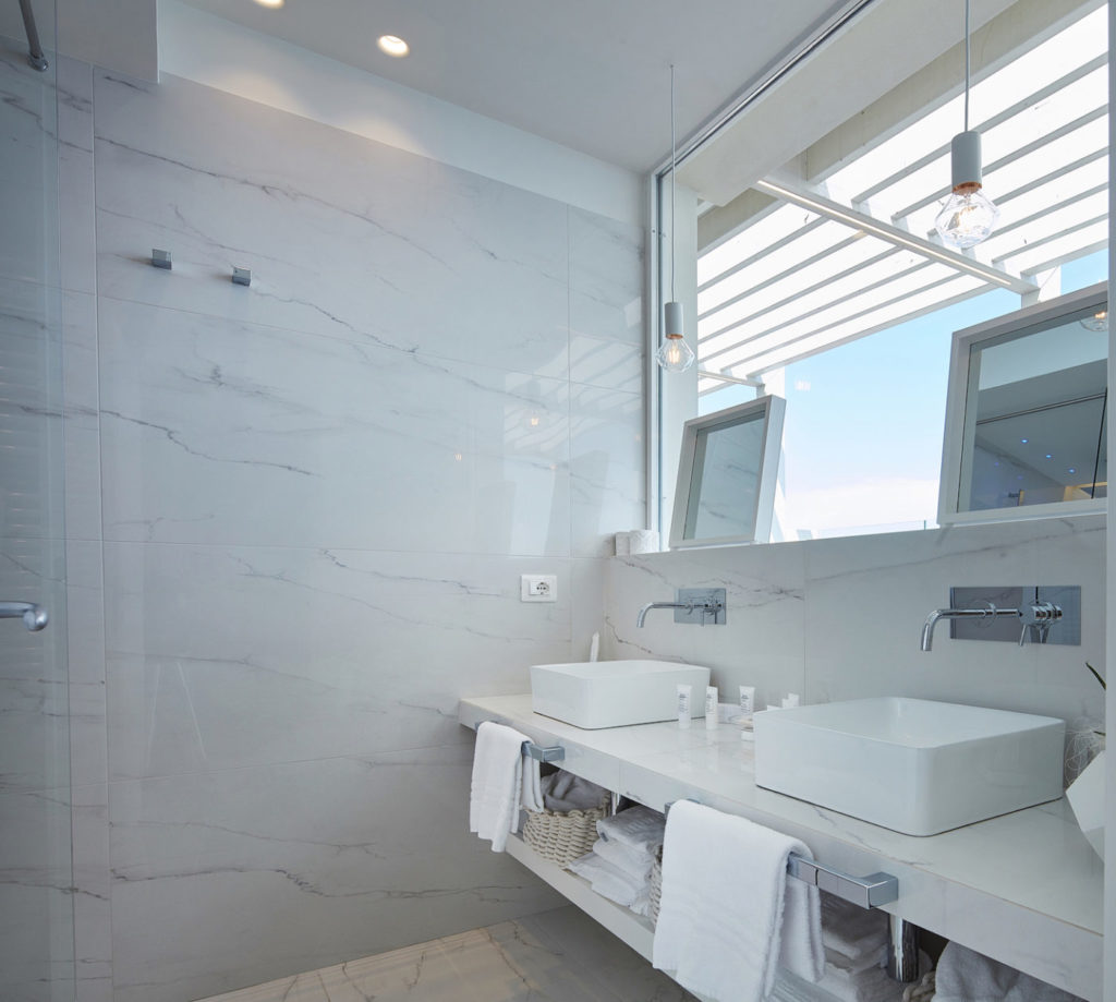 Con l’obiettivo di dare un tocco di modernità agli interni delle camere, sono stati invece utilizzati diversi formati della serie di gres porcellanato effetto resina matt di Elements Design nella tonalità White. La serie, ispirata alle grandi metropoli internazionali, è infatti concepita per dare agli spazi architettonici un tocco di glamour contemporaneo.