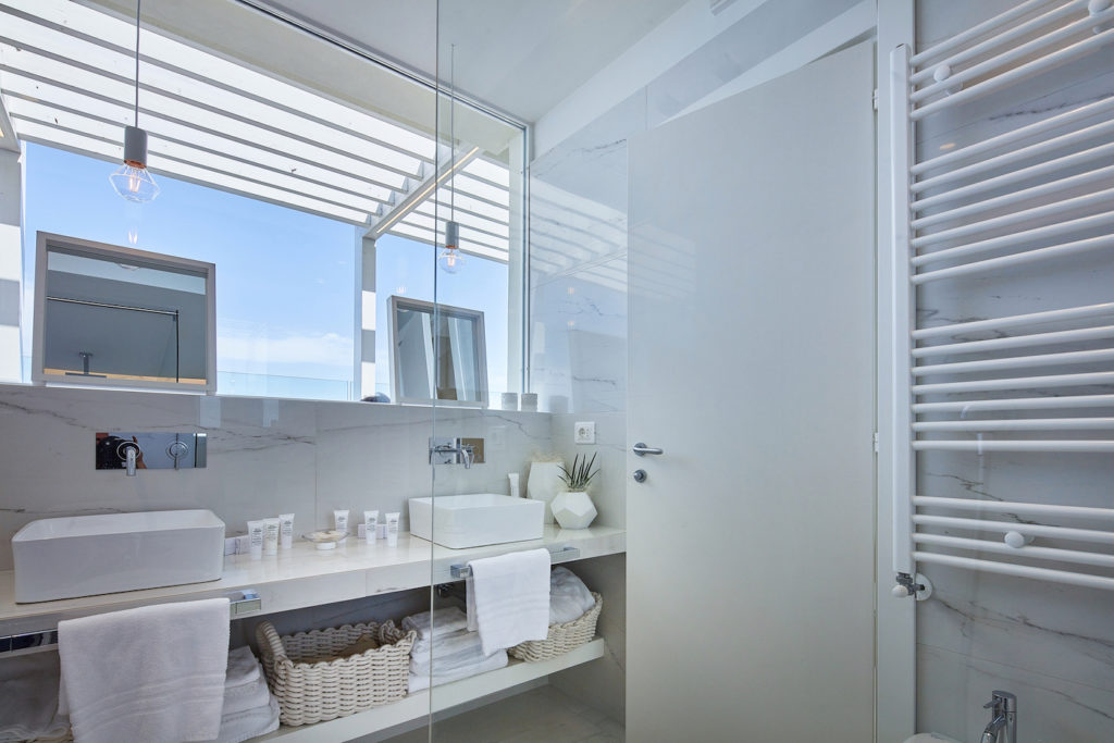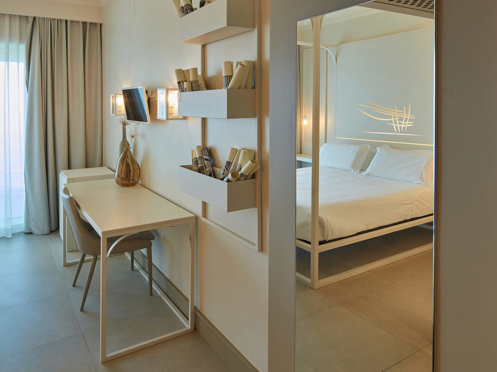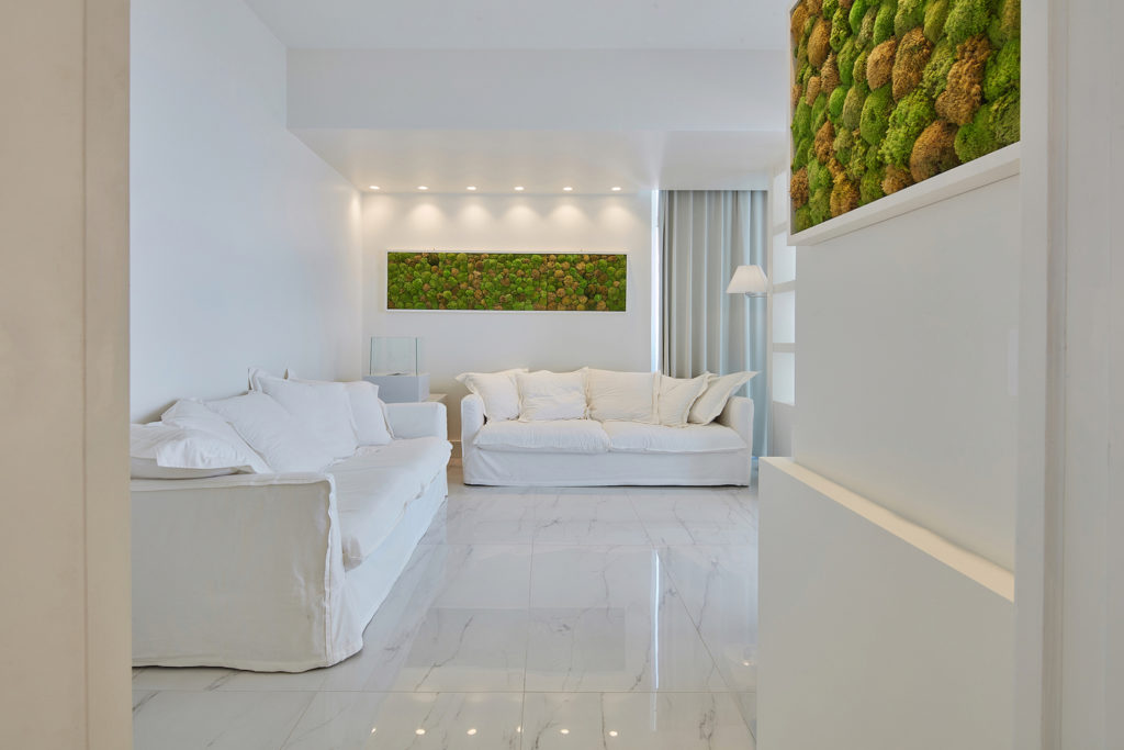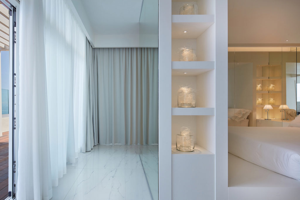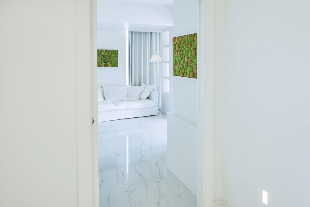 Il design della Suite, concepita per essere uno spazio etereo, di un candore assoluto, capace di riflettere la luce calda del Mediterraneo, guadagna profondità grazie alle diverse gradazioni e finiture di bianco delle collezioni Elements Lux e Elements Design di Keope.