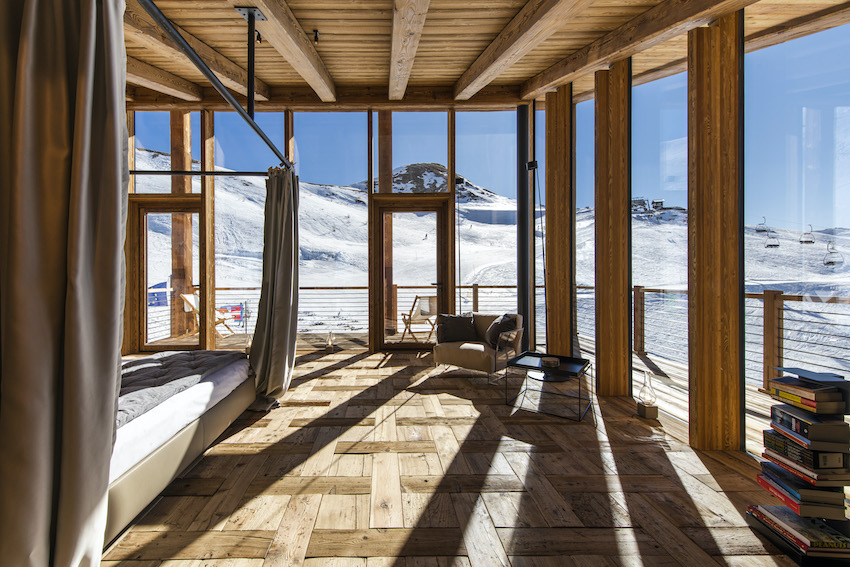 Gli interni vedono la successione di materiali della tradizione e soluzioni su misura ma un uso parco di arredi e accessori, perché protagonista assoluto è il panorama, che grazie all’importante vetrata strutturale – che raggiunge un’altezza di 5,9 metri nel suo punto più alto – invade gli spazi per l’ospitalità, che cambiano aspetto in funzione della luce, della stagione, dell’orario del giorno e delle sue condizioni meteorologiche.