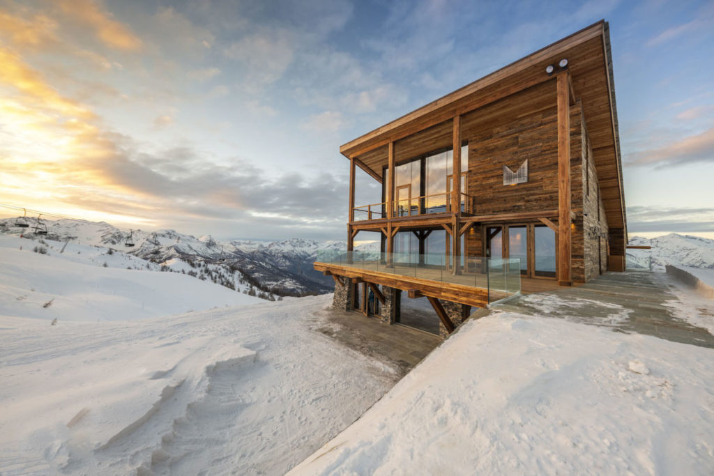 Un passo indietro: ci si trova in alta Val di Susa, in Piemonte, nel Comune di Sauze d’Oulx, parte del complesso sciistico della Vialattea, alla quota di 2420 m e in prossimità della cresta che divide la Val di Susa dalla Val Chiasone, con una vista spettacolare che spazia dal Monte Chaberton al Monte Rocciamelone, a pochi metri dalla vetta e a 800 metri di dislivello dal primo centro abitato, raggiungibile in inverno attraverso un percorso in motoslitta della durata di circa 15 minuti. Qui negli anni Cinquanta era stato inaugurato il Rifugio La Marmotta e fino agli anni Ottanta rappresentava una tappa fissa per turisti e sciatori. Dopo decenni di disuso la struttura era in forte degrado, tanto da suggerirne la demolizione a favore di una nuova costruzione: è così nato l’attuale La Marmotta, nuovo riferimento per la ristorazione e la ricezione di Sauze d’Oulx.
