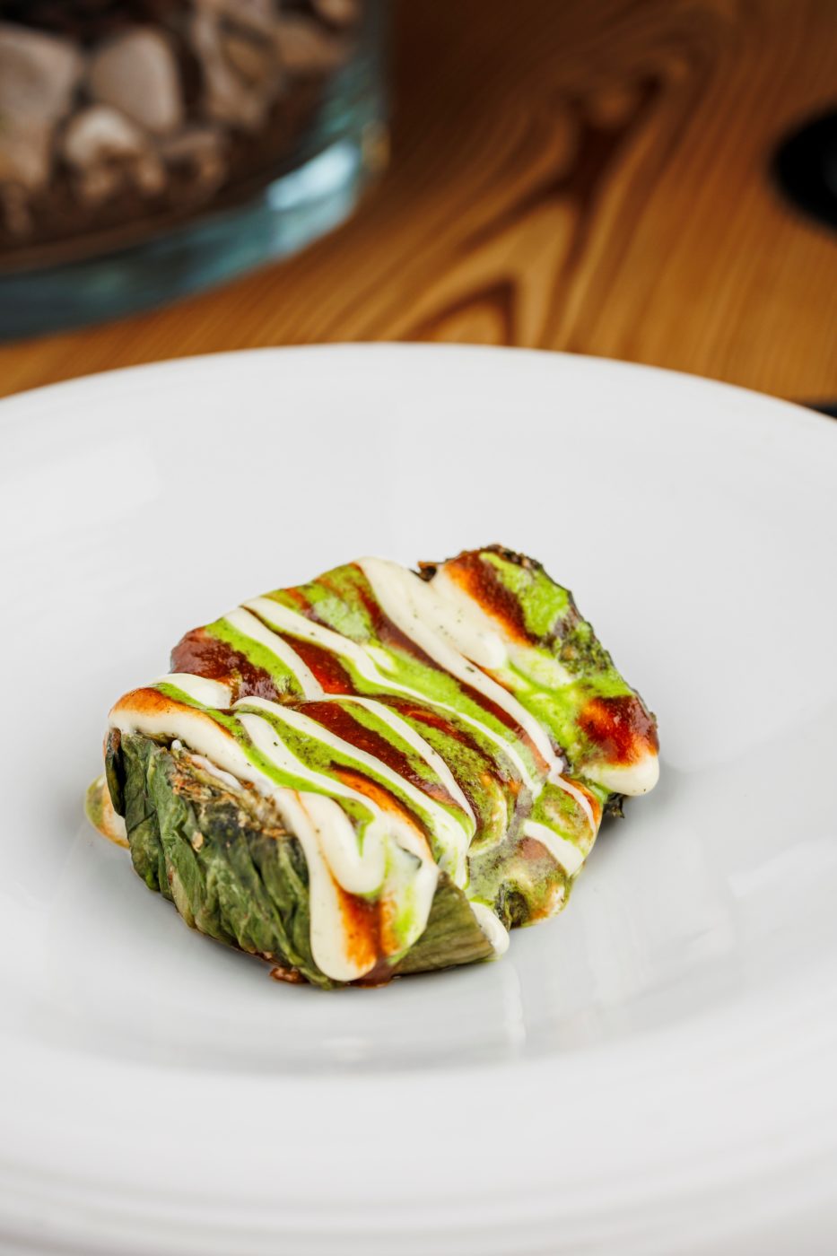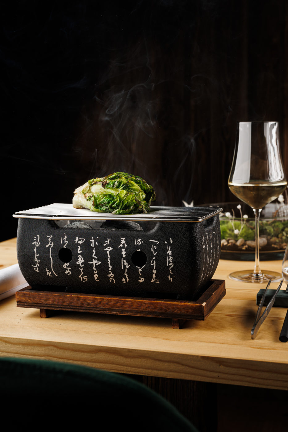 Tra gli antipasti spicca la Scarola ripiena di pane raffermo, maionese al levistico, fondo vegetale e crema al prezzemolo; l’Uovo di selva in crosta di polenta, fonduta di caciotta di capra e tartufo nero e Verticalità Vegetale con sedano rapa, patata, ravanelli, zucchine, rapa bianca, maionese vegana alla curcuma, maionese vegana al pomodoro, maionese vegana al carbone vegetale, maionese vegana allo spinacio.