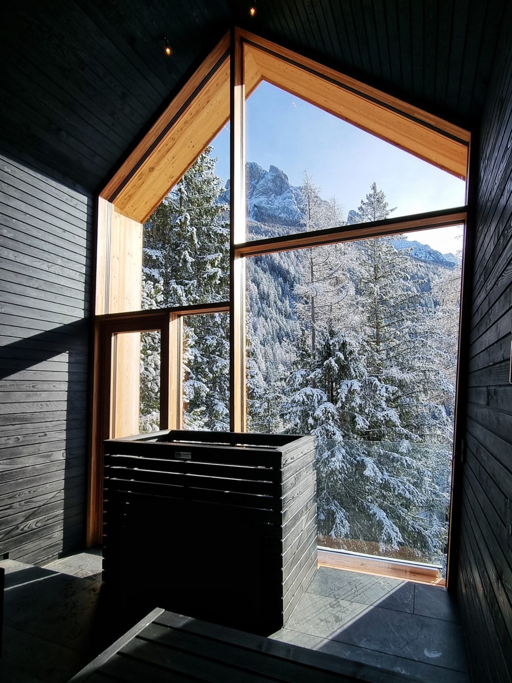 Per chi vuole privacy assoluta e una mini-SPA esclusiva, in particolare, Natural SPA Chalet è uno chalet proiettato sul panorama, dove su piani diversi si trova una stanza per la doccia, una sauna col panorama sul Sassolungo, doccia emozionale, idromassaggio nella natura all’esterno, un divano in rete sospeso tra un piano e l’altro. Lo Spa Chalet è perfetto per chi desidera silenzio e relax.