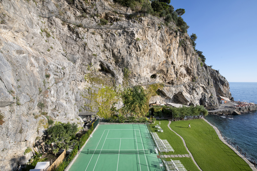 Il resort offre anche un’esclusiva spiaggia privata, raggiungibile tramite un ascensore scavato nella roccia, che invita gli ospiti a immergersi nella bellezza naturale della costa.