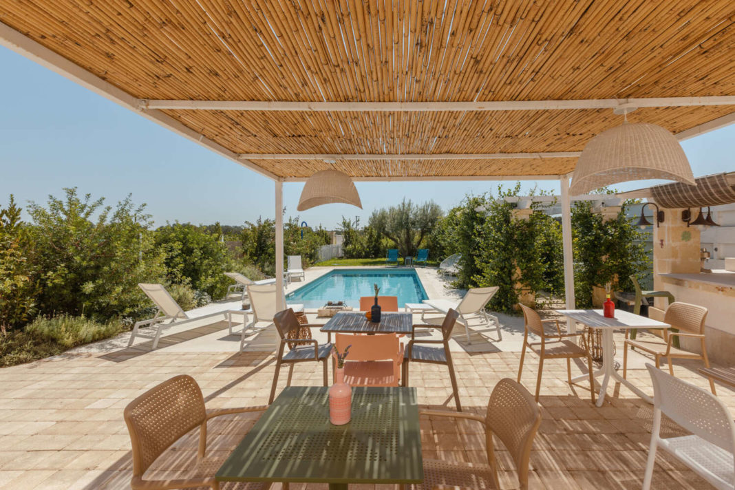 Oltre che attraverso l’architettura, la Puglia si trova a Masseria Ella anche in tavola: le colazioni sono infatti a base di ingredienti locali e proposte da fornitori vicini a Pulsano, dal forno per il pane fino ai coltivatori di frutta. Un dettaglio: gli ospiti, se vogliono, hanno anche accesso all’orto privato della masseria, dove cogliere pomodorini o erbe per le loro ricette. L’orto fa parte del più ampio progetto per il verde sviluppato da Gianni Birardi, di Gianni Birardi Landscape, che così ne descrive il percorso: “la nostra filosofia è creare un luogo immerso nella natura, permettendo di percepire gli odori e i profumi che offre. I nostri giardini, con essenze aromatiche, mirano a curare mente, corpo e cuore. L’obiettivo è offrire un’esperienza unica ai committenti e agli ospiti della Masseria, vivendo le quattro stagioni con cambi di colori e odori ogni mese. Gli orti consentono di raccogliere frutta e verdura, offrendo la gioia di farlo manualmente tra alberi di frutti antichi. La fluidità della Masseria si manifesta nei percorsi naturalistici, sfruttando ogni spazio per accedere al frutteto e all’orto”.