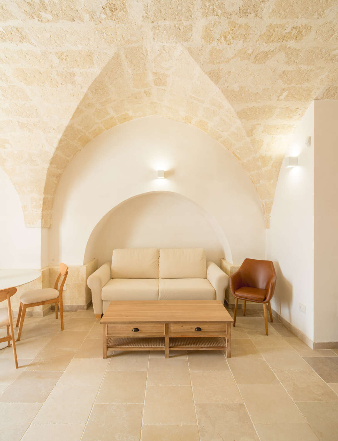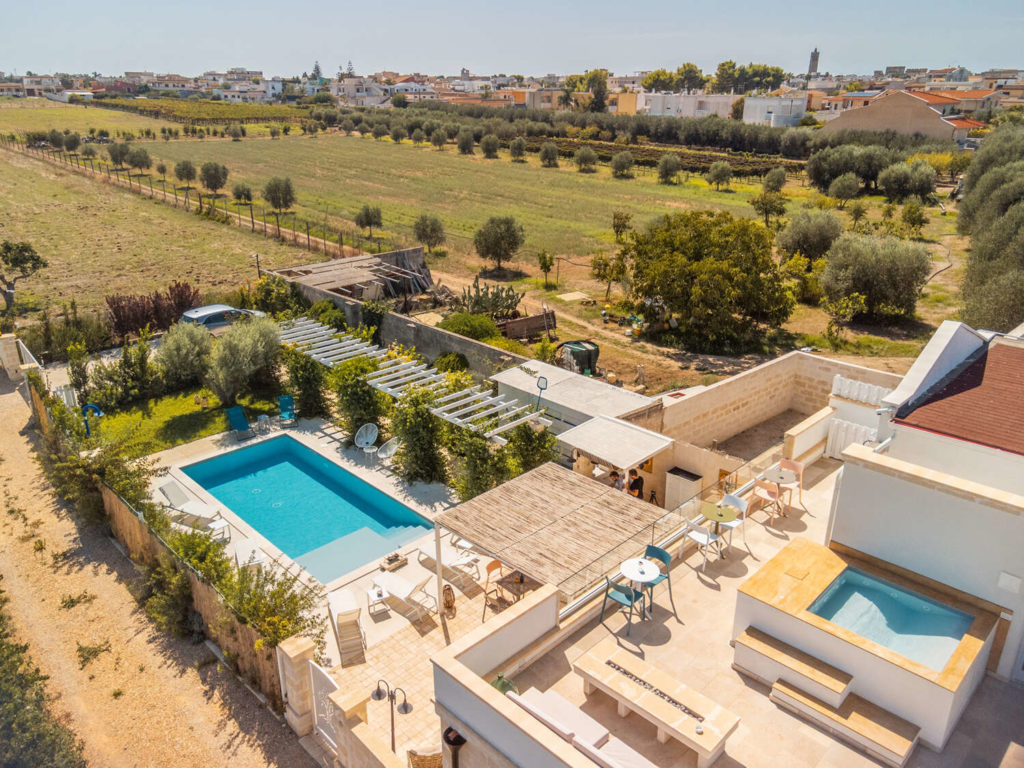 Con vista sulla piscina o sul giardino che circonda la struttura, le tre camere portano i nomi delle piante caratteristiche del luogo: la Junior suite Ulivo e le camere Vite e Grano. La junior suite può essere considerata un monolocale; distribuita su circa 50 mq, ha un angolo cottura, un bagno con doccia walk in, un letto matrimoniale e un divano letto. La ristrutturazione, seguita direttamente dai proprietari e particolarmente impegnativa dal momento che la struttura era in disuso da circa cento anni, ha voluto rispettare e recuperare i materiali originali, le volte a botte e le volte a stella, oltre ai pavimenti in Roccato di Ostuni. Per coerenza progettuale, diversi arredi sono inoltre stati realizzati da artigiani locali.