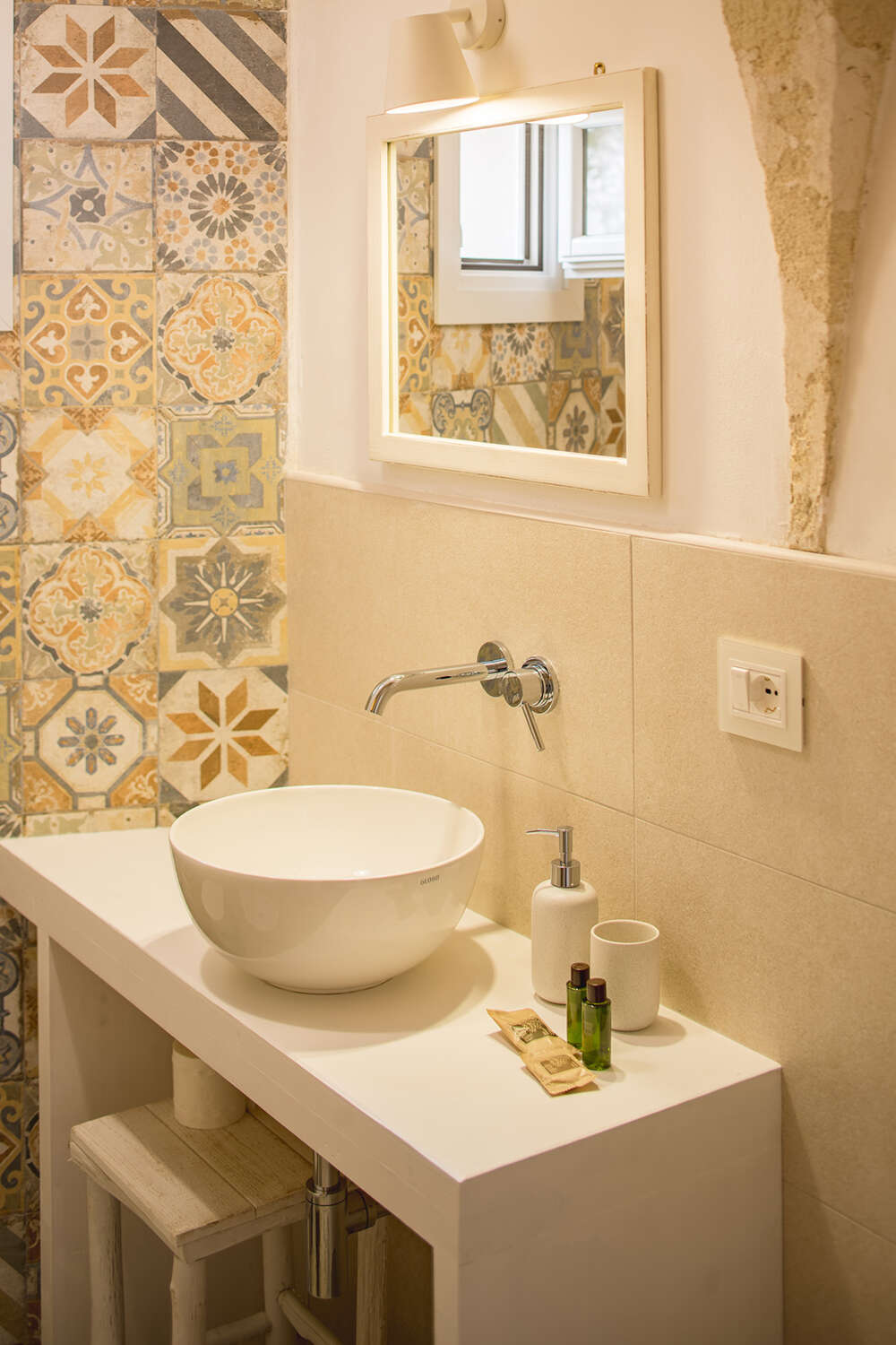 La camera matrimoniale Vite ha, come la precedente, un angolo cottura ed è adatta ad ospitare fino a tre persone, dal momento che ha sia un letto matrimoniale che una poltrona letto. Anche in questo caso l’intervento di ristrutturazione ha preservato la tipologia rurale tipica, nelle strutture e nei materiali. La Grano si trova al primo piano della masseria ed è rivolta verso la campagna, con vista su un campo di grano, ulivi e viti; ha accesso diretto verso la terrazza panoramica, a servizio di ogni camera e dove sono stati posizionati una minipiscina idromassaggio e un biocamino a muratura. Al suo interno, la piccola cucina è stata ricavata dove un tempo era collocata l’antica cucina a camino. Le tre camere presentano diversi piccoli dettagli scelti direttamente dalla proprietà, ciascuno inserito per creare un’atmosfera accogliente per quanto non troppo carica: dalle ceramiche artigianali di Impronte d’Arte di Luigi Delliponti di Pulsano e Rosa Creazioni di Grottaglie, alla biancheria da letto e da bagno di Caleffi, a semplici soluzioni pensate per l’ospitalità contemporanea, dalla macchina per caffè Nespresso ai materassi Dreamflex.