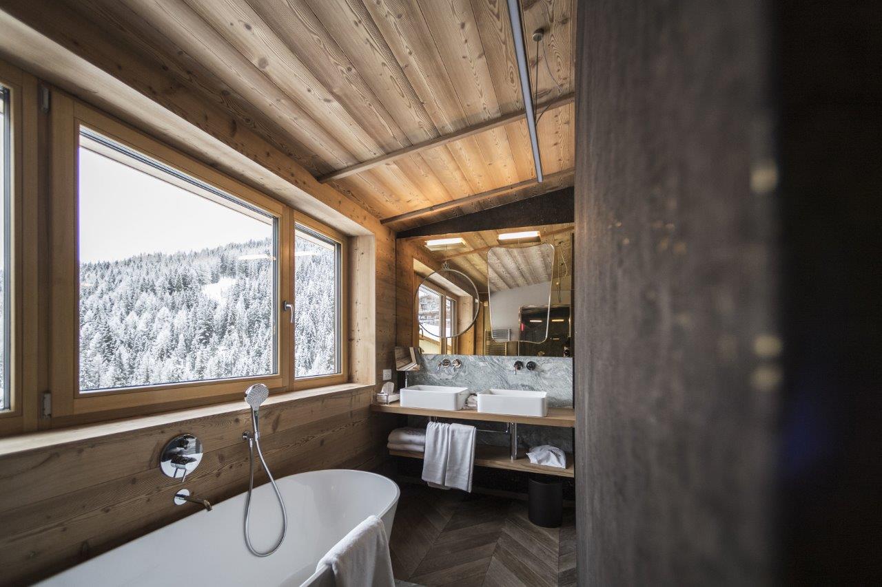 Per la Penthouse del Rosa Alpina, Tiziano Vudafieri e Claudio Saverino hanno operato una rivisitazione della tradizione con un sapiente mix tra genius loci, materiali tradizionali ed elementi di design contemporaneo. Tra i complementi d’arredo spiccano pezzi di Tom Dixon, Edra, Fornasetti, Gubi, Fritz Hansen, Driade e altri. Oggetti di design che danno un tocco di colore e sofisticata eleganza ad ambienti dominati dal legno e dai materiali tipici delle costruzioni montane.