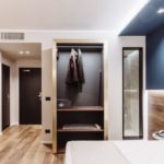 Gli arredi su misura, disegnati dallo studio Italia and Partners, alternano l’ottone spazzolato alla laccatura opaca. L’armadio è stato volutamente lasciato a giorno, in linea con le ultime tendenze negli alberghi che hanno una prevalenza di clientela business. Il mobile di fronte al letto ha ha la triplice funzione di porta valige, scrivania e frigo bar.
