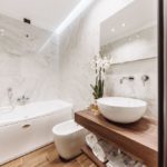 Il bagno è rivestito in grès porcellanato effetto marmo di Carrara, alternato a pareti smaltate color tortora opaco. Due dei quattro bagni hanno la doccia che si affaccia sulla camera grazie ad una vetrata fumé. Il bagno di una delle quattro camere Deluxe comprende una vasca idromassaggio Jacuzzi ed è rivestito interamente in grès porcellanato, sempre effetto marmo di Carrara.
