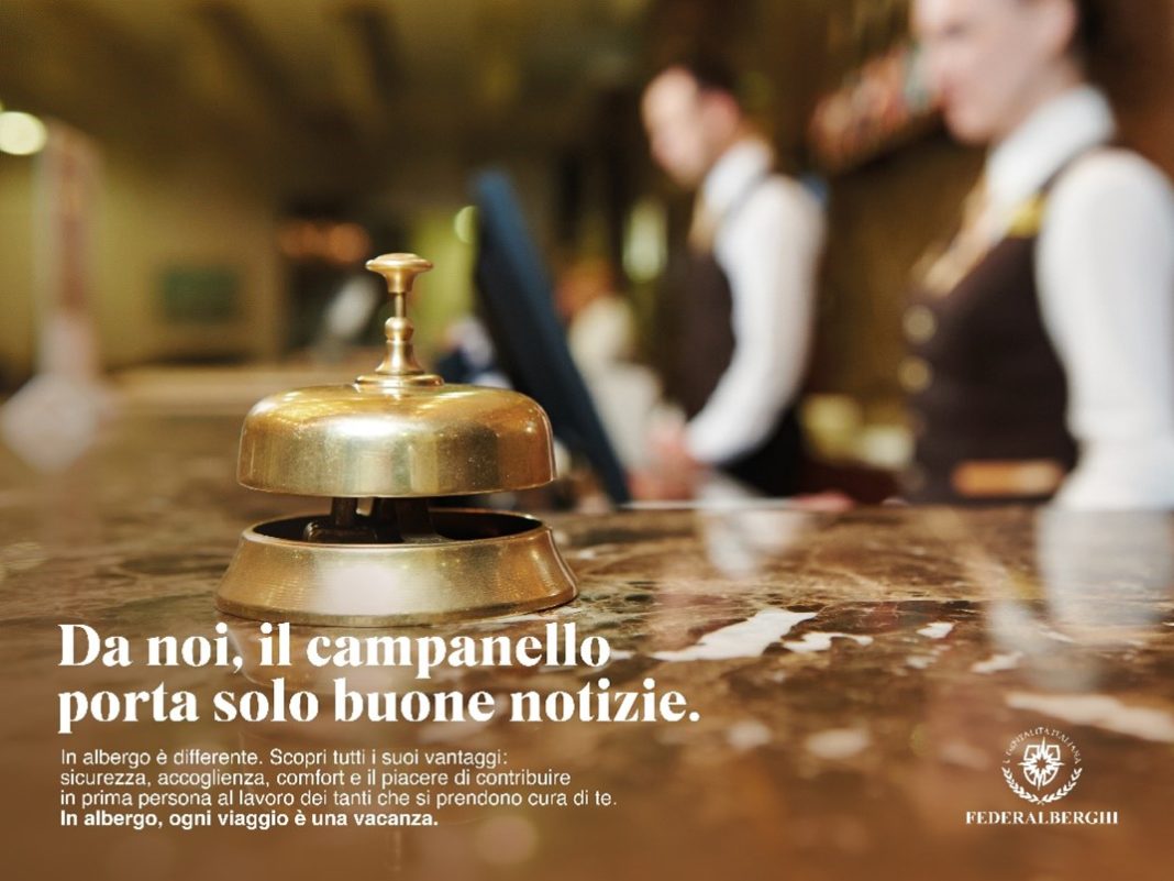 Quanto alla campagna collegata alla ricerca, si basa sul fatto che “se non è in albergo, non è una vera vacanza: lo pensa l’88,8% degli italiani, che scelgono il soggiorno in hotel piuttosto che negli affitti brevi in case private“. È quindi questo il dato che ha dato origine al concept strategico della campagna di comunicazione di Federalberghi, realizzata dall’agenzia The Washing Machine Italia e che si articola in più soggetti che raccontano la varietà dell’offerta dell’hotel e il carattere multidimensionale dei suoi servizi. Nella scelta dei visual della campagna, sono state esaltate le qualità uniche dell’albergo, il comfort estremo e le molteplici possibili attività (differentemente da una casa privata).