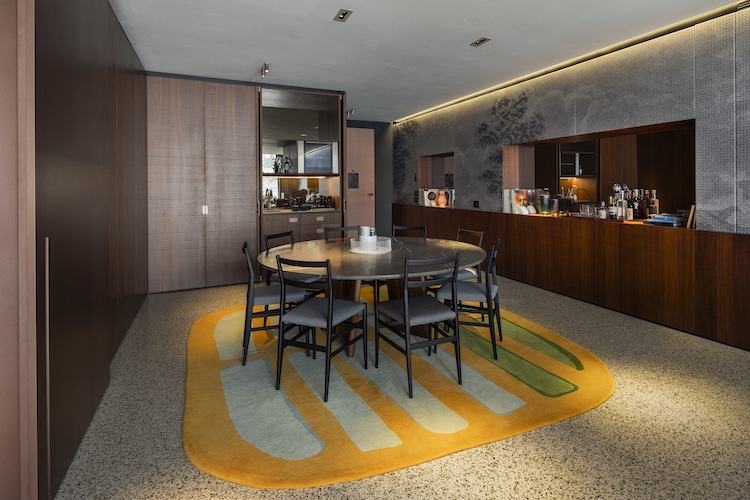 Il design di Patricia Urquiola concorre a definire l’esperienza di ascolto: una parete di 15 metri rivestita in tessuto jacquard personalizzato richiama il movimento dell’acqua e ottimizza l’acustica, mentre pannelli in noce, elementi scultorei in bronzo e un grande tavolo da pranzo in pietra creano un teatro di texture e luce. Così, divani Molteni, sedie Leggera di Gio Ponti e superfici tattili definiscono invece le aree per l’ascolto, il relax e la convivialità.