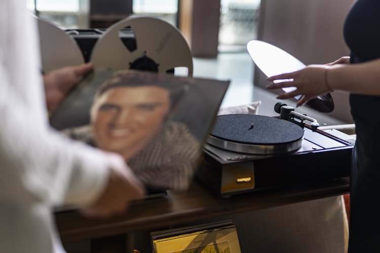 Il sistema audio della suite oggi include diffusori Klipsch La Scala II, amplificatore McIntosh MC275, preamplificatore C22, giradischi Thorens 1601 con testina Sumiko Amethyst e un Revox: un impianto dalle performance elevatissime, per apprezzare gli oltre 500 LP della collezione, dai cofanetti della Deutsche Grammophon a prime stampe di David Bowie.