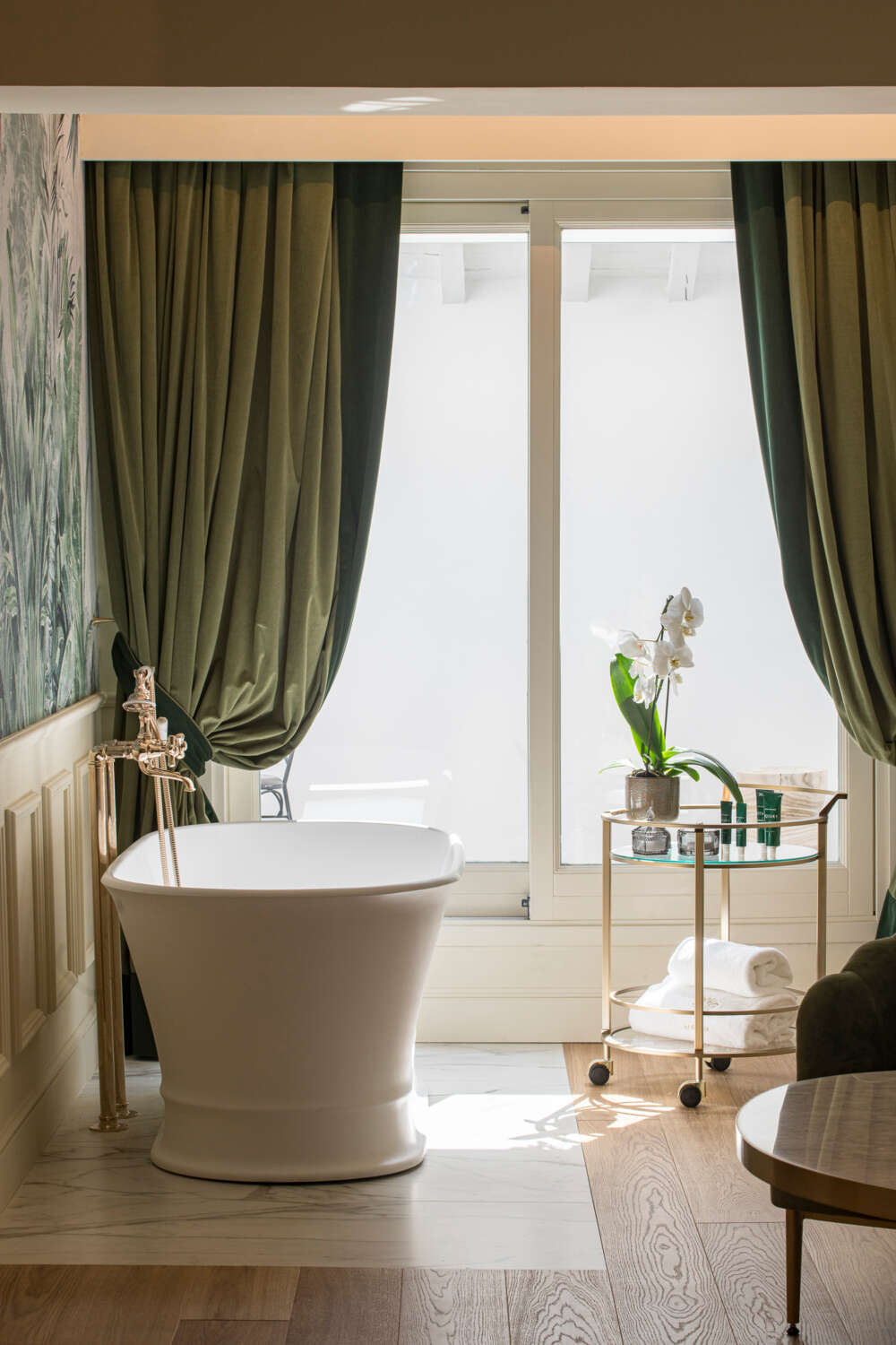 Sempre a proposito di interior design, Design by Gemini ha voluto riflettere negli interni le tonalità della vicina cattedrale: rosa cipria, avori e verdi accesi definiscono le scelte cromatiche che seguono motivi geometrici ispirati all’Art Déco e si ritrovano nei tessuti pregiati, negli arredi realizzati su misura e nei marmi.