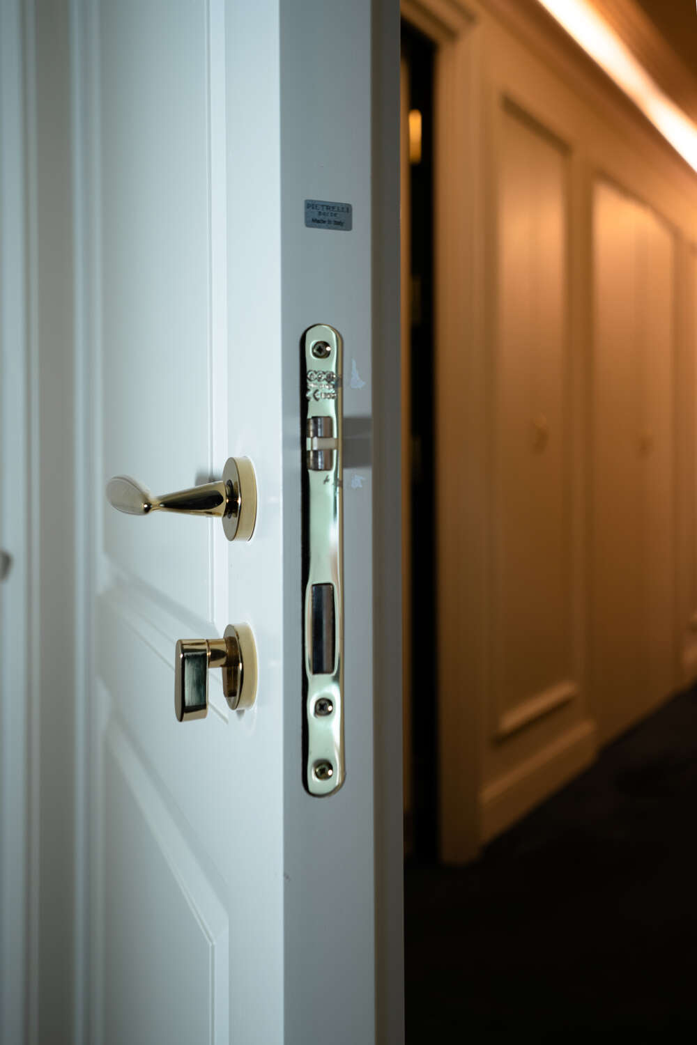 Per le 39 camere del La Gemma Hotel e le altrettante porte di ingresso interne, i progettisti si sono rivolti a Pietrelli Porte, il cui catalogo comprende una sezione dedicata al settore dell’hôtellerie. Nello specifico, le porte sono state realizzate con finitura laccato RAL 1013 opaco, con pantografatura su disegno e l’applicazione di cornici. Il pomo e la maniglia sono realizzati con finitura ottone lucido. Le porte rispettano una serie di requisiti tecnici, dalla certificazione EI60 – codice che indica la resistenza al fuoco delle porte interne, all’abbattimento acustico a 42 decibel. Comprendono, inoltre, serratura antipanico, incontro elettrico, contatto magnetico e chiudiporta a incasso.