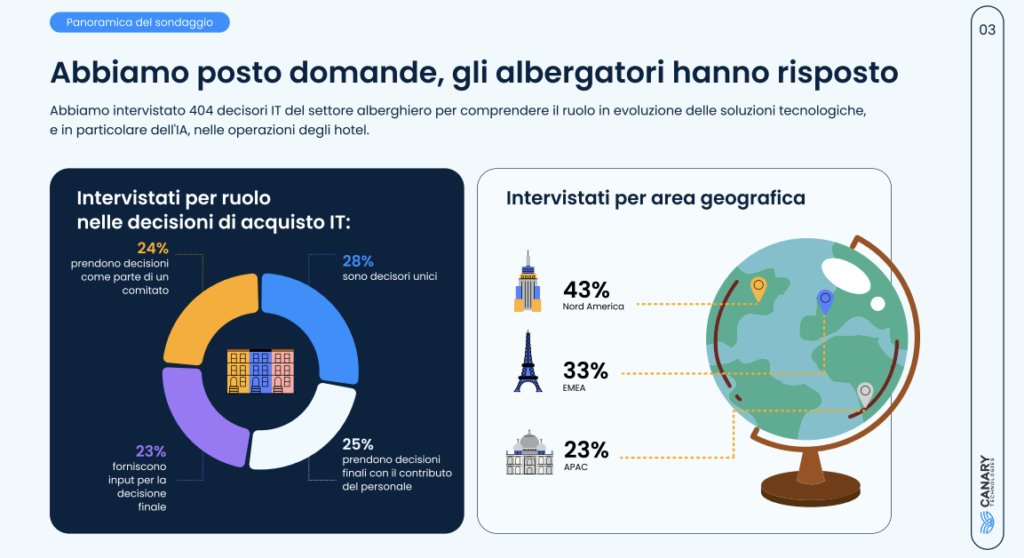 Il report si basa su un sondaggio globale condotto all’inizio del 2026 su oltre 400 professionisti responsabili delle decisioni di acquisto tecnologico in hotel, società di gestione e brand. Rappresenta una vasta gamma di strutture di diverse dimensioni e categorie in Nord America, EMEA e APAC.