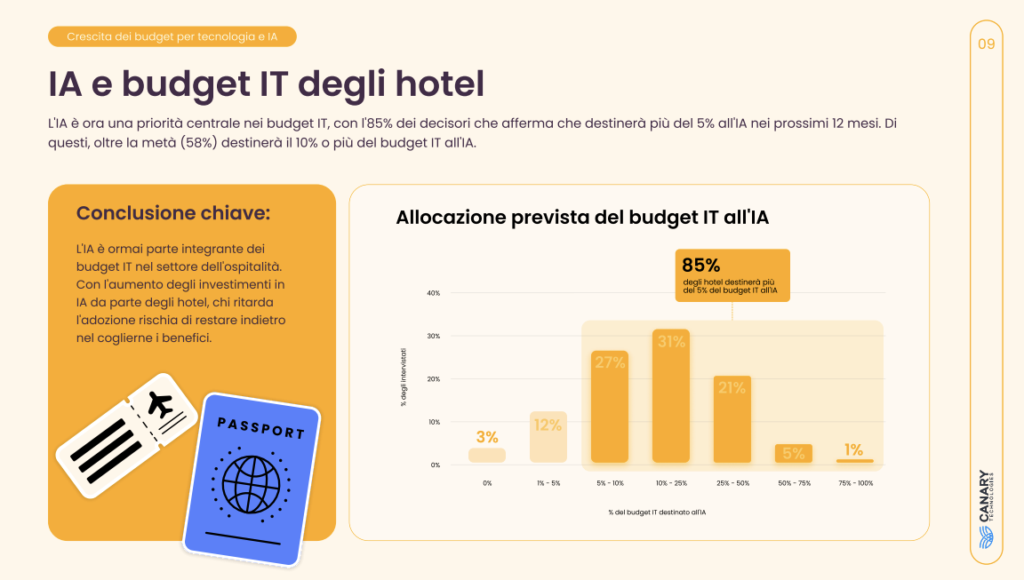 Gli albergatori prevedono un forte impatto dell’IA e stanno effettuando investimenti significativi in questa tecnologia. Secondo lo studio, il 71% dei professionisti del settore ritiene che l’IA stia avendo un impatto significativo o trasformativo sull’industria e l’85% prevede di destinare nel 2026 almeno il 5% del proprio budget IT agli strumenti di IA.