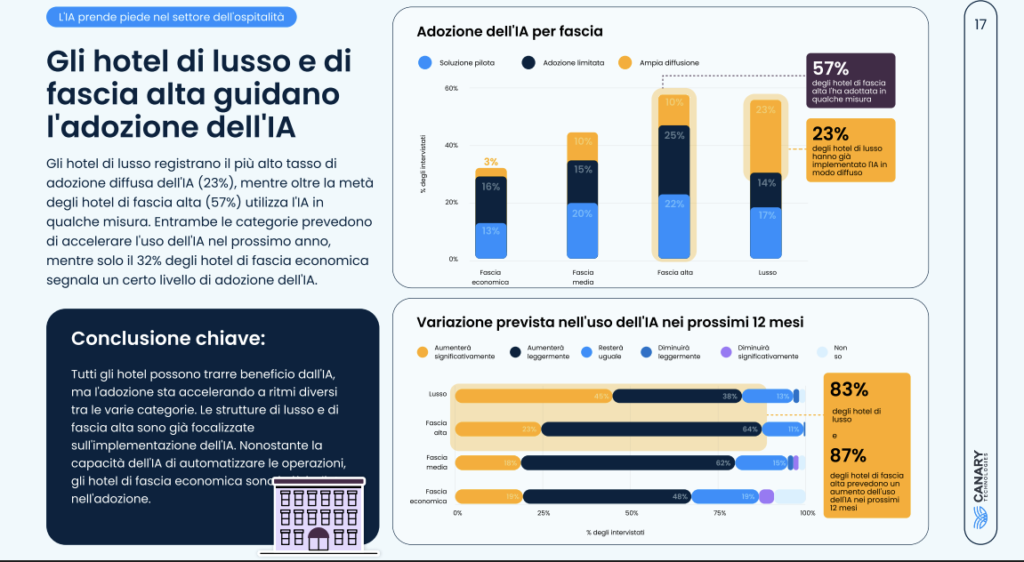 Confermano il trend le parole di Catherine Donaldson, direttrice marketing di Canary Technologies: “L’IA è diventata rapidamente una tecnologia fondamentale per il settore alberghiero. Gli albergatori che oggi stanno ottenendo un vantaggio competitivo non si limitano a considerare l’IA: stanno sviluppando strategie e adottandola rapidamente. I dati dimostrano che gli hotel che utilizzano l’IA stanno aumentando i ricavi, migliorando l’efficienza operativa e incrementando la soddisfazione degli ospiti.”