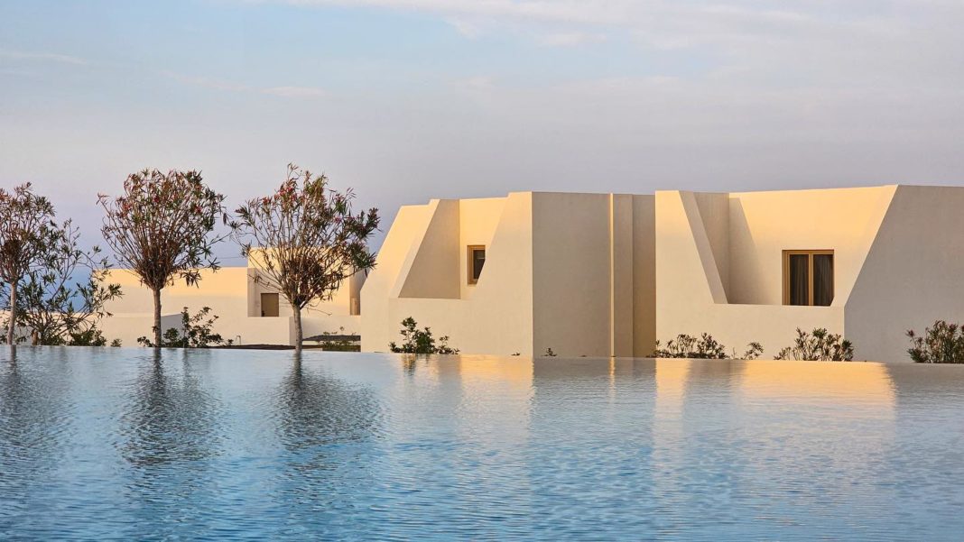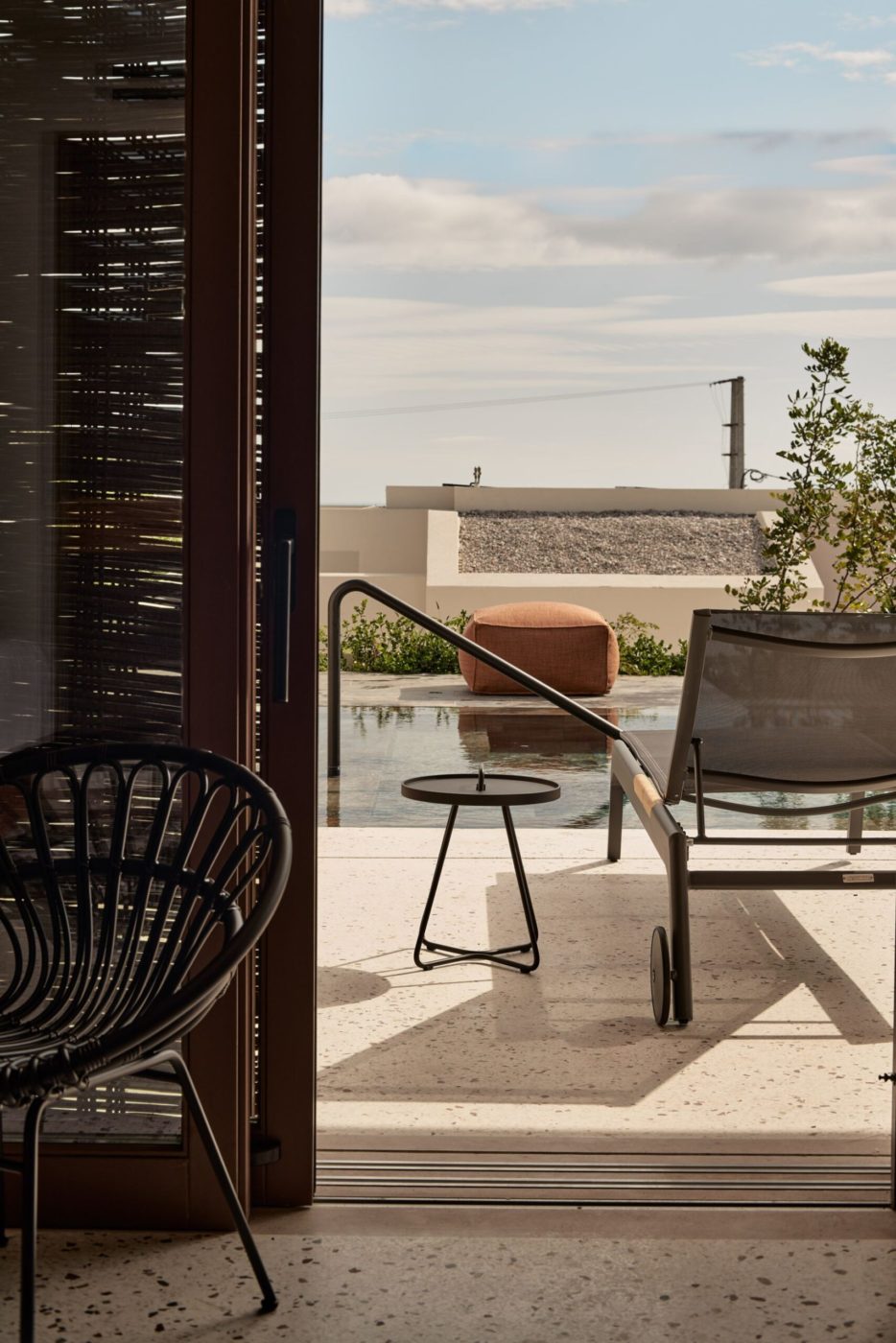 Il progetto degli architetti ha voluto rimandare ai principi estetici dell’architettura mediterranea, così le suites e le camere della struttura si inseriscono con grande discrezione del paesaggio, e anche gli arredi e i tessuti sembrano appartenere in modo naturale alle tradizioni del luogo. E non è un caso che a suggerire i colori della palette della struttura sia stato il murales ritrovato nel sito archeologico di Akrotiri, nell’area a sud dell’isola.
