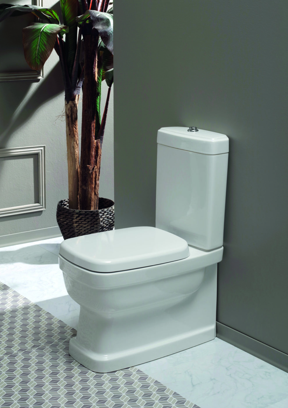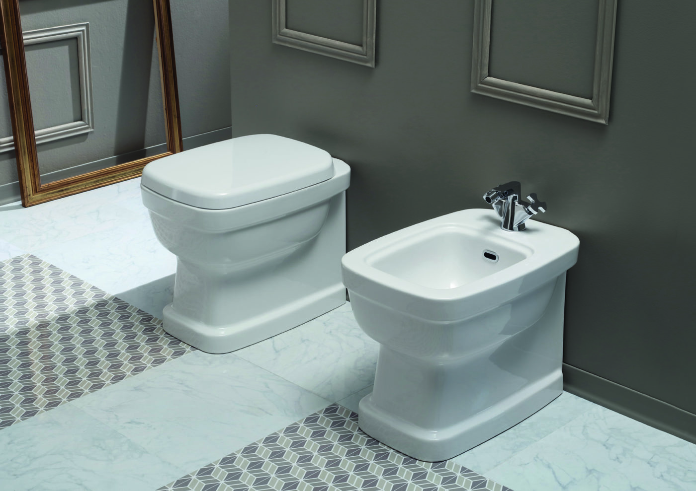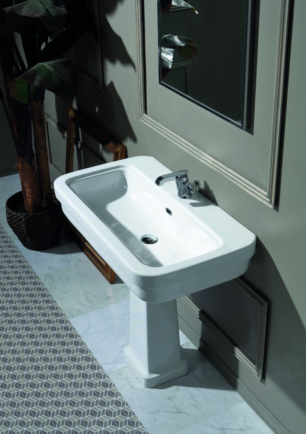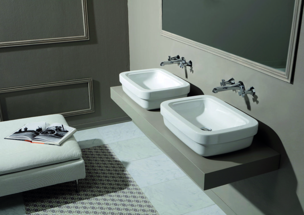 La consolle, i lavabi e i sanitari sospesi sono caratterizzati dalla forma semi-squadrata, con uno specifico richiamo all’antico nel doppio bordo sulle fasce di ogni elemento, il che dà una decisa e nuova percezione degli ingombri, grazie anche al design “particolareggiato”, forte e robusto, che connotava i sanitari di inizio secolo scorso.
