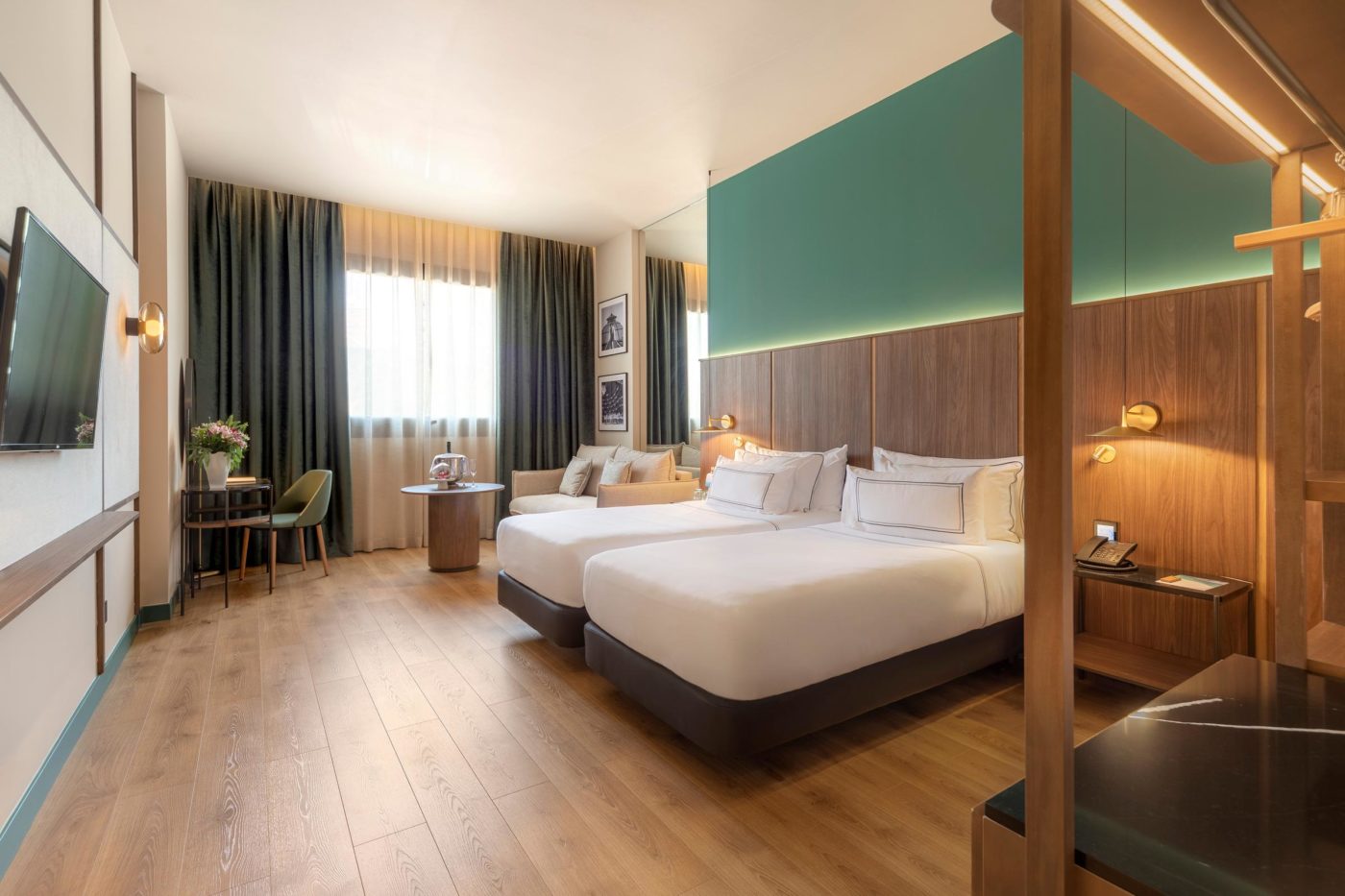 Firmato da Alvaro Sans, il progettista della catena spagnola, l’intervento ha visto il ridisegno degli spazi comuni, delle sale congressi, delle camere e della hall: in quest’ultima l’immagine è stata profondamente modificata ed è connotata da una forte presenza del legno che separa e mette in connessione gli spazi e da un verde discreto ma molto diffuso. Il verde – inteso stavolta come colore e non come vegetazione – torna nelle camere e nei corridoi già ristrutturati, in cui nuance accoglienti e calde creano un’atmosfera intima e soft.