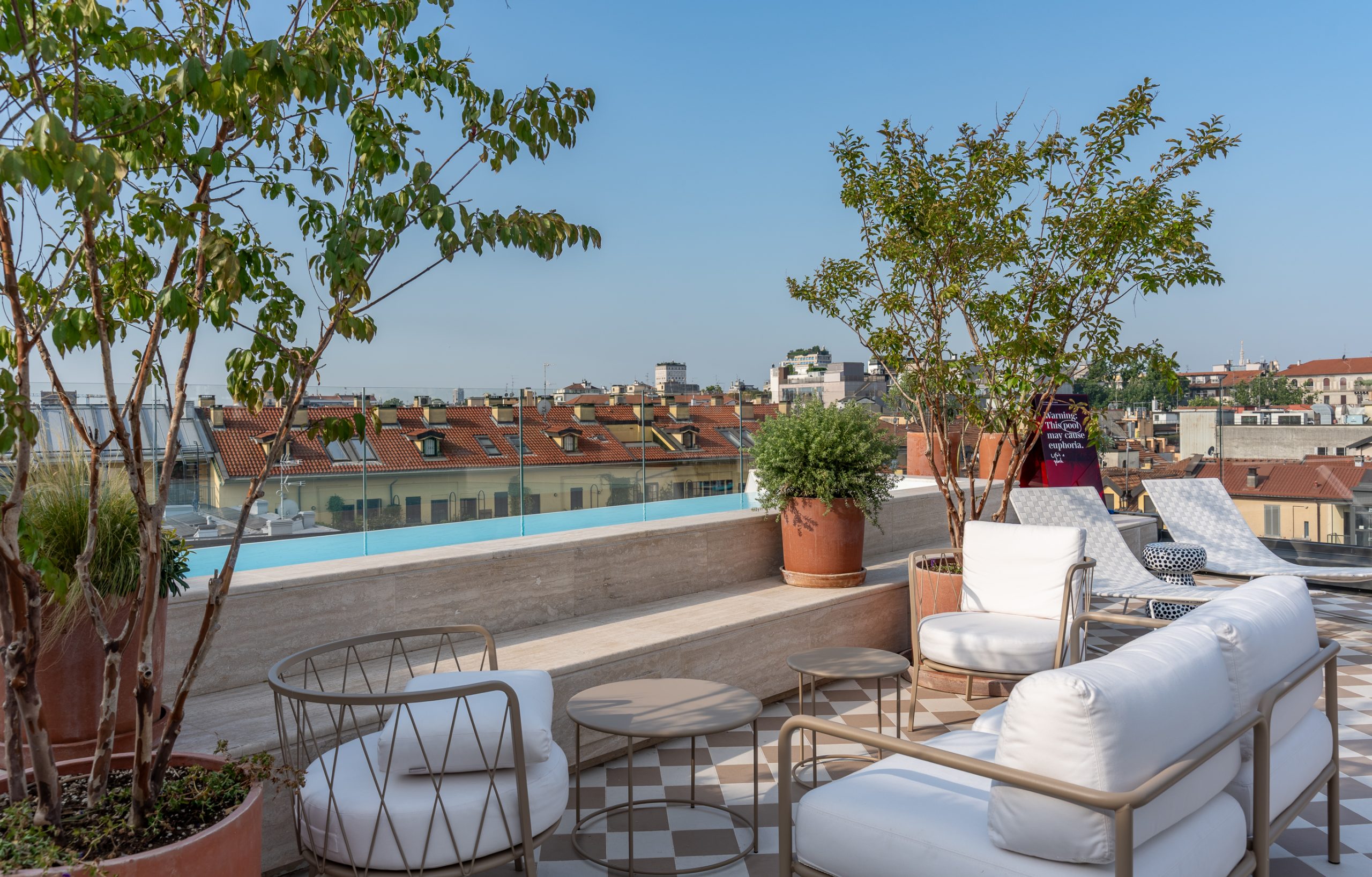 All’ultimo piano dell’hotel troviamo il rooftop con il Pool Bar, immerso nello skyline milanese e incorniciato dalla piscina all’aperto. Al piano inferiore si trovano altre due terrazze, mentre al piano terra si trova il Garden Cafè – che unisce il gusto del caffè italiano alla cultura internazionale del cocktail, per una colazione, un business lunch smart o un aperitivo nel cuore della città.