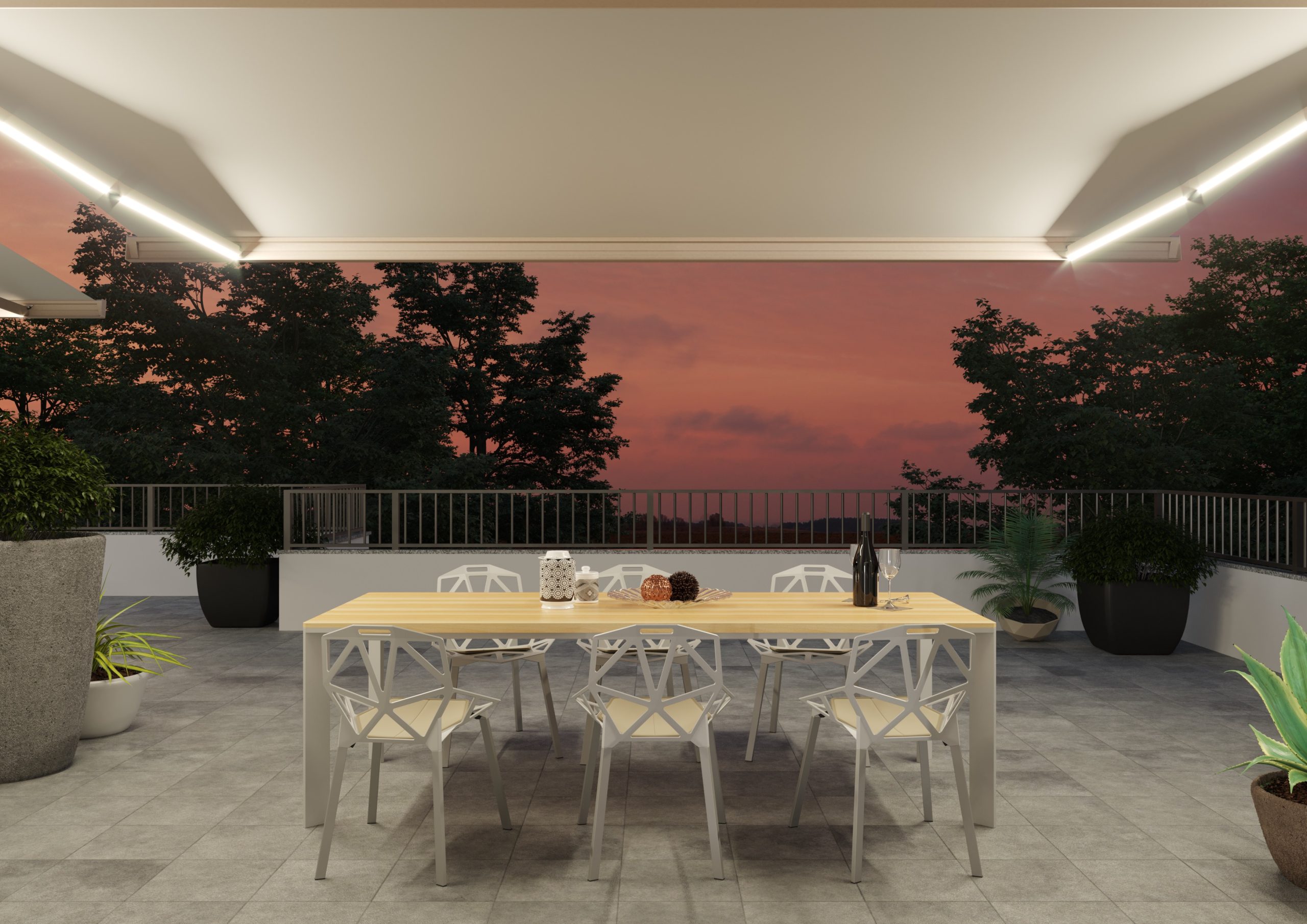 La punta di diamante della linea. Totalmente preassemblata, senza giunzioni visibili e dotata di cassonetto completo, la R95 Stone offre anche bracci a pantografo con illuminazione led integrata. La regolazione micrometrica dell’inclinazione e le dimensioni generose (fino a 800×425 cm) la rendono ideale per ampi spazi. Disponibile in 62 colori senza sovrapprezzo, con bulloneria nascosta per un’estetica pulita e contemporanea.