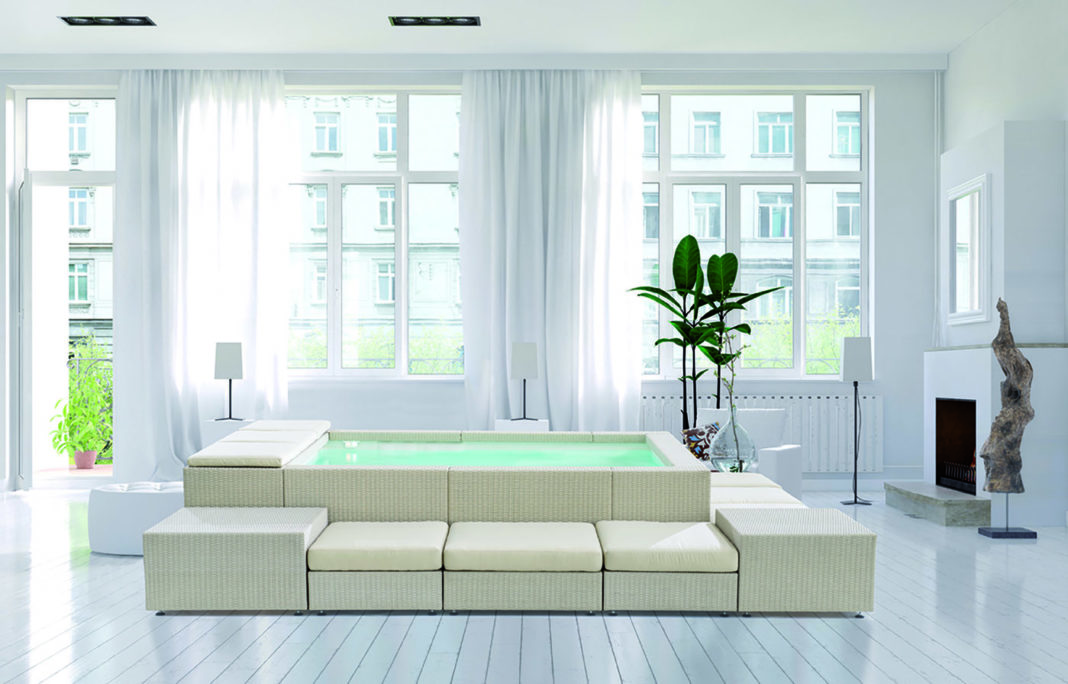 Playa Living è una nuova concezione di salotto, un habitat a tutto tondo dove poter sorseggiare una bibita adagiati comodamente sui morbidi ed eleganti cuscini modulabili, disponibili nei colori natural, brown, grey e water, che circondano lo specchio di acqua temperata e di bolle regolabili.