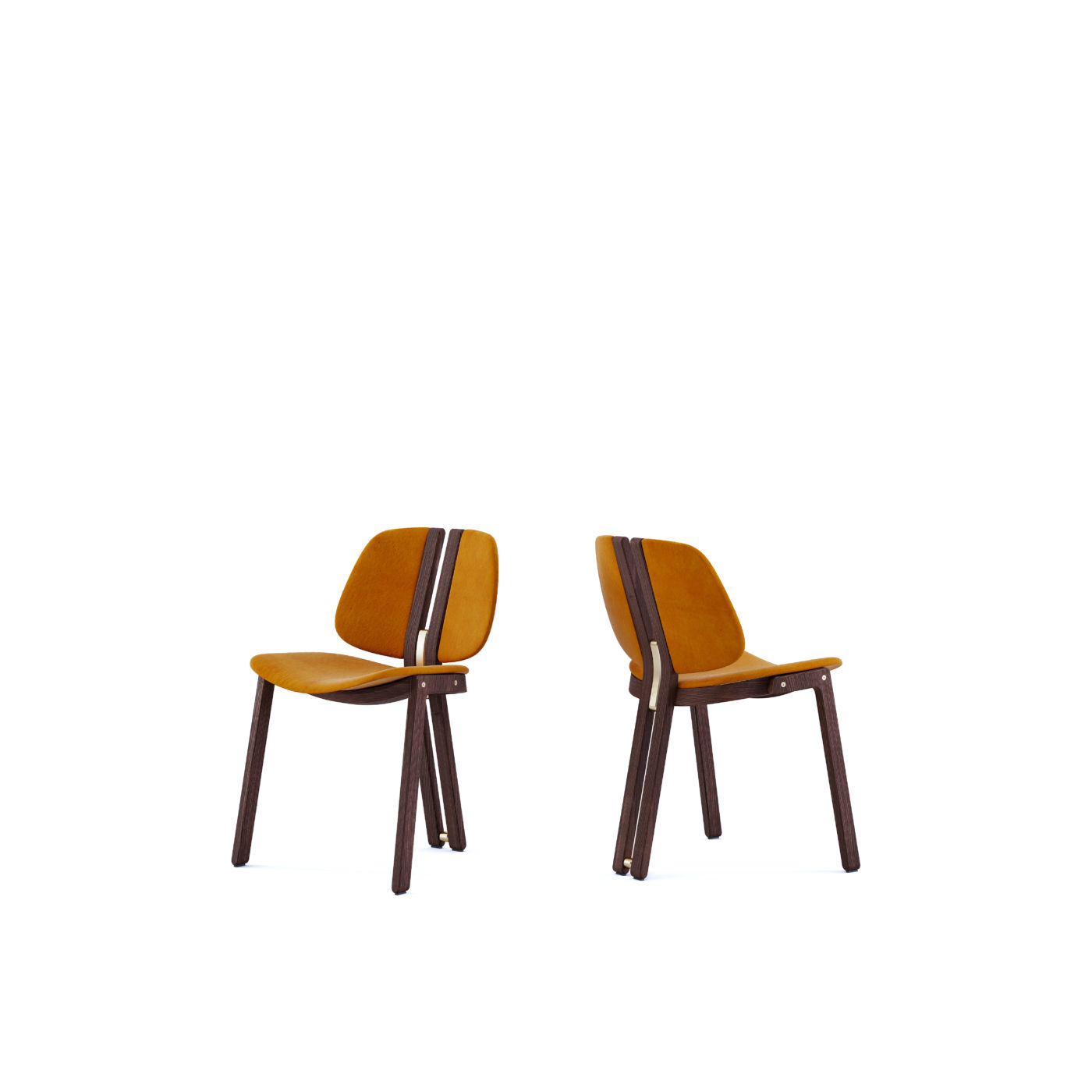 Gli elementi sono quelli delle sedute classiche – uno schienale, le quattro gambe – anche le forme sono canoniche e il materiale, il legno, è tradizionale. Eppure l’immagine finale di Giano, di Paolo Castelli, è molto originale e richiama il dualismo della divinità bifronte di cui porta il nome nell’apparente incontro delle due gambe posteriori nella sezione centrale, prolungate verso lo schienale a determinarne la perfetta scissione in due elementi gemelli. L’essenza duale di Giano si rivela nelle due versioni disponibili, con struttura in legno di frassino tinto Noce o frassino tinto Black, entrambe definite da dettagli metallici finitura Ottone o Black.