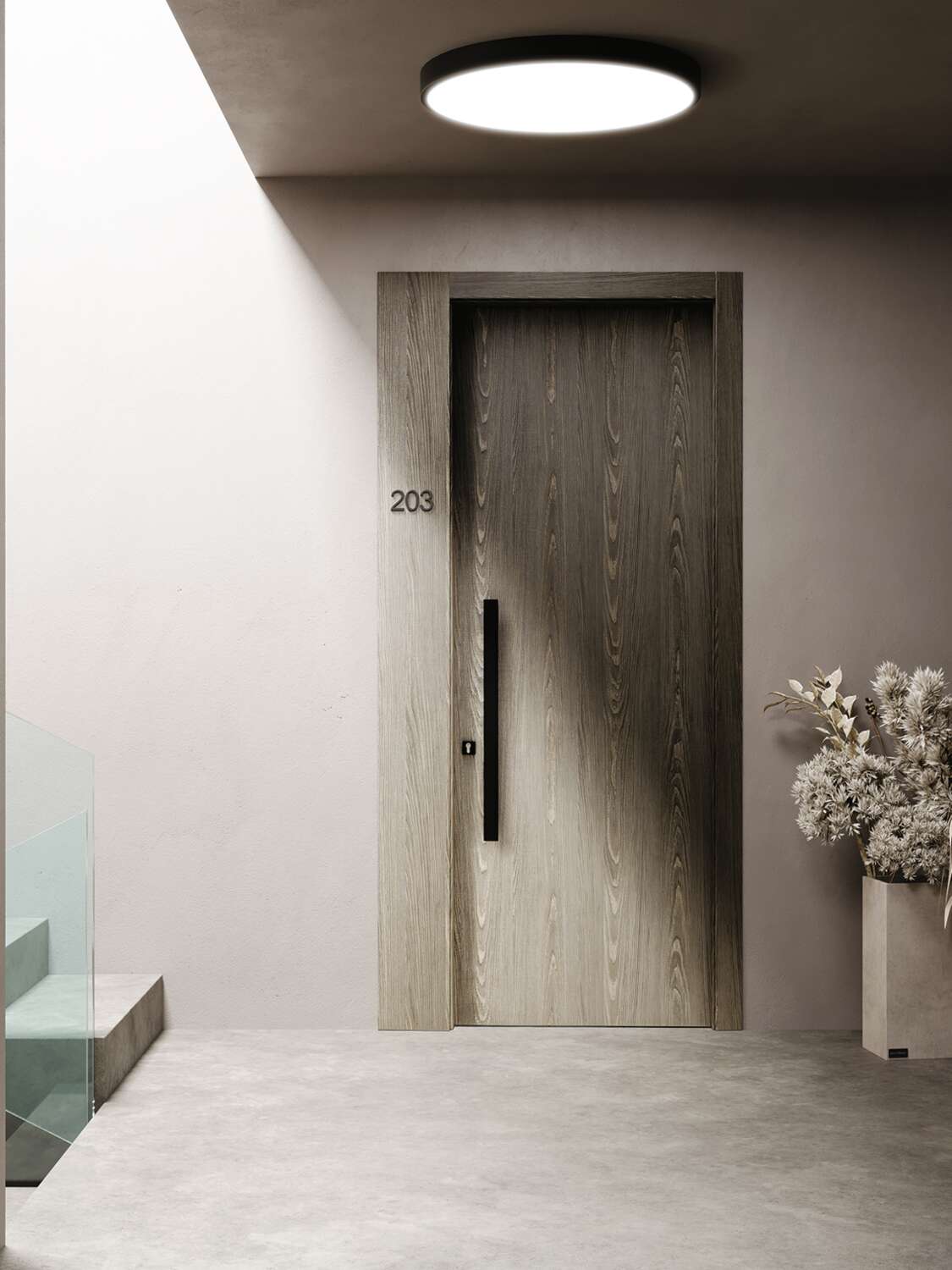 La porta tagliafuoco Bifenix di Bertolotto, combinazione di sicurezza avanzata e design sofisticato, offre una protezione superiore contro il fuoco, garantendo un aspetto estetico raffinato perfettamente inseribile in un contesto ricettivo. Disponibile nelle versioni 45 e 60 dB, è caratterizzata da un’anta di spessore 44 mm, battuta dritta complanare al telaio, realizzata in materiale ignifugo certificato interno, struttura perimetrale doppia in legno massello selezionato ed essiccato al netto dei nodi, ad alta densità secondo certificazione e tamburata con cartelline in mdf Idro, Carb Fsc.