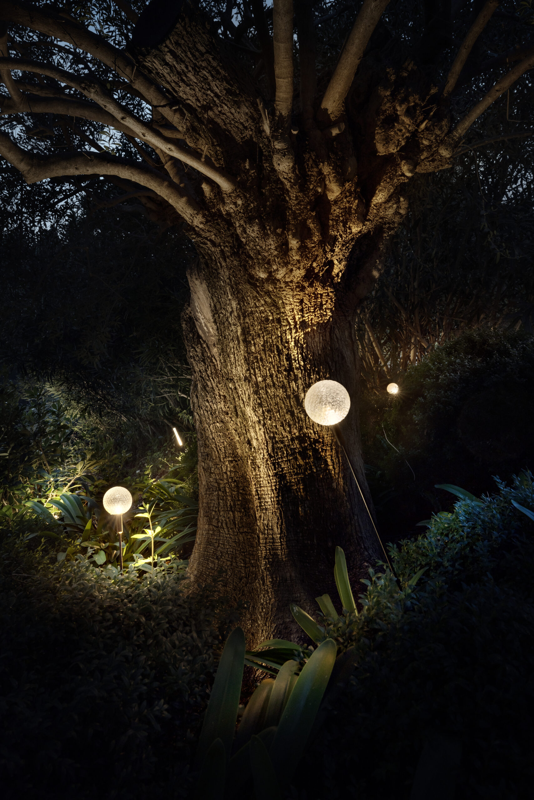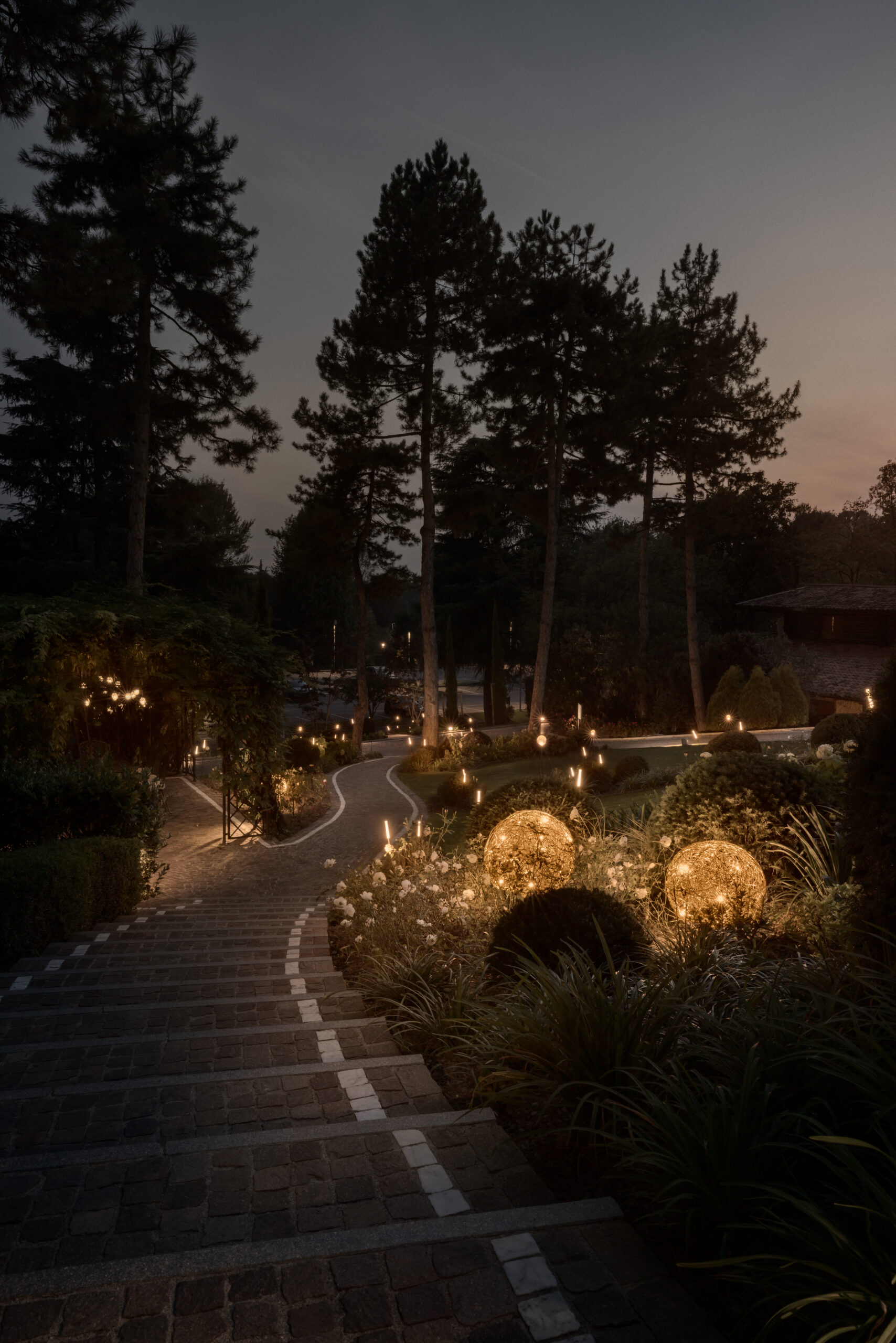 Nel complesso ricettivo, l’illuminazione firmata Catellani & Smith disegna un percorso di luce che abbraccia l’intera proprietà, a partire dal parco. Il progetto outdoor valorizza i sentieri immersi nella rigogliosa vegetazione, dove le lampade Fil de Fer, Syphasera, Syphasfera e Syphaduepassi definiscono il percorso con scenografici giochi di luce.