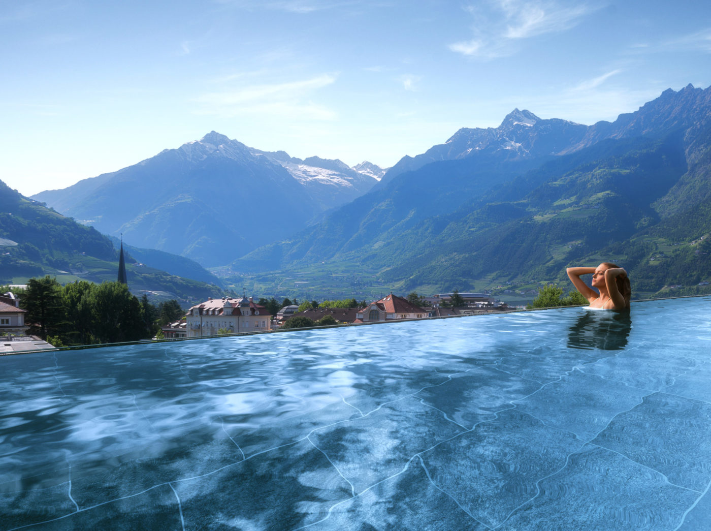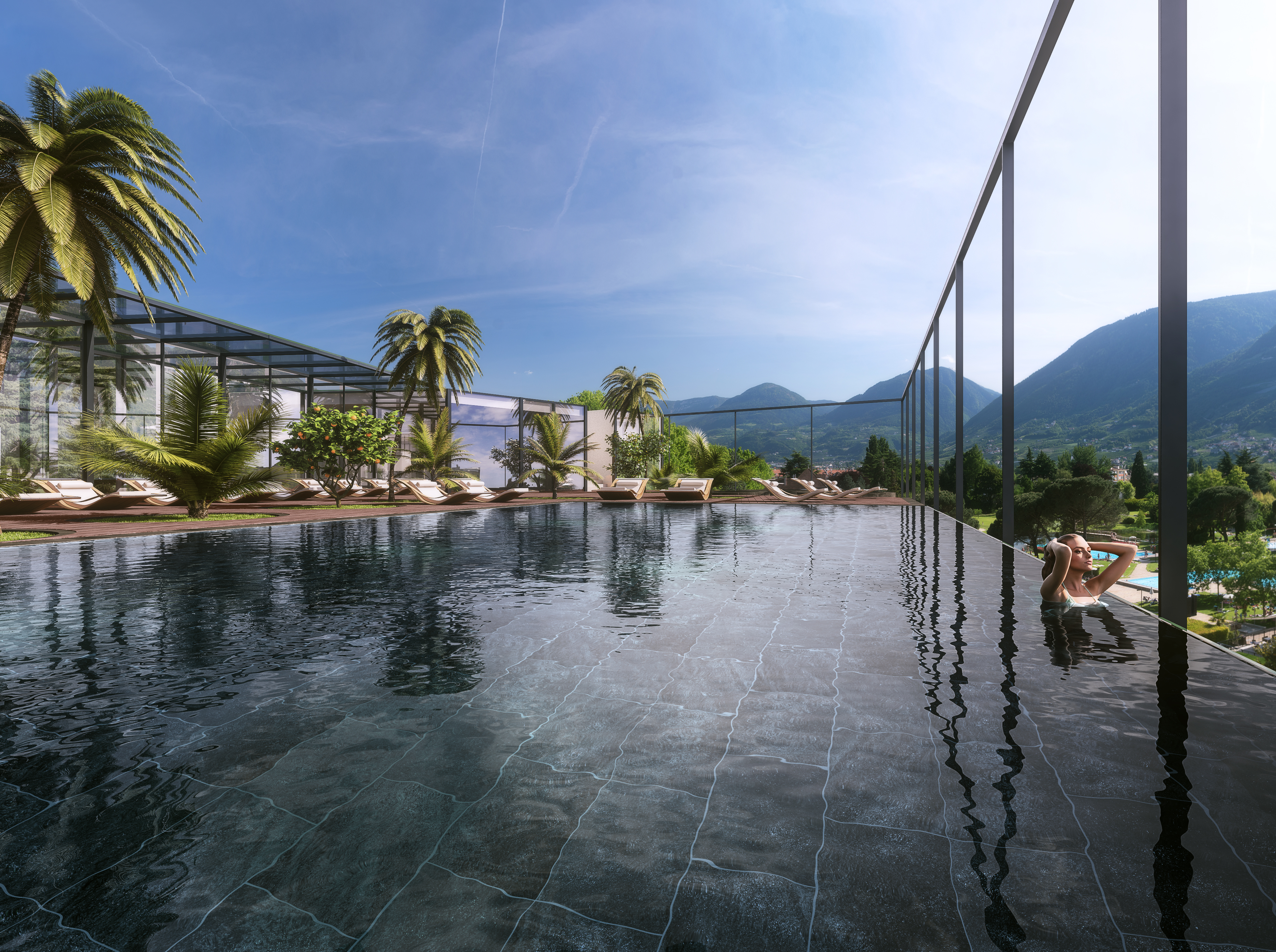 Accessibile a chi ha più di 14 anni, la Sky Spa dell’Hotel Terme Merano offre ampie zone relax all’aperto, l’Infinity-pool scoperta e riscaldata (36°C), lunga 22 metri e larga 7.6 metri con accesso interno ed esterno, in ogni stagione dell’anno, e con postazioni micromassaggio. Tre whirlpool all’aperto, un giardino con palme, cabine per trattamenti benessere con vista panoramica e consulenza di esperte estetiste e terapeute. Ampia zona sauna: finlandese, alle erbe, bagno di vapore, le vaporizzazioni in sauna e una vasca a immersione con acqua fredda. Non manca la sala fitness panoramica con attrezzature moderne e una vasta offerta di attività sportive proposte da un istruttore di fitness qualificato. Un valore aggiunto ai comfort proposti dall’hotel benessere per eccellenza dove, grazie alla sua posizione centrale, l’ospite può godere di tutte le comodità che offre la città. Clima mediterraneo, panorama incantato che vede protagonisti il centro storico, il fiume Passirio, le Alpi e il Parco delle Terme.