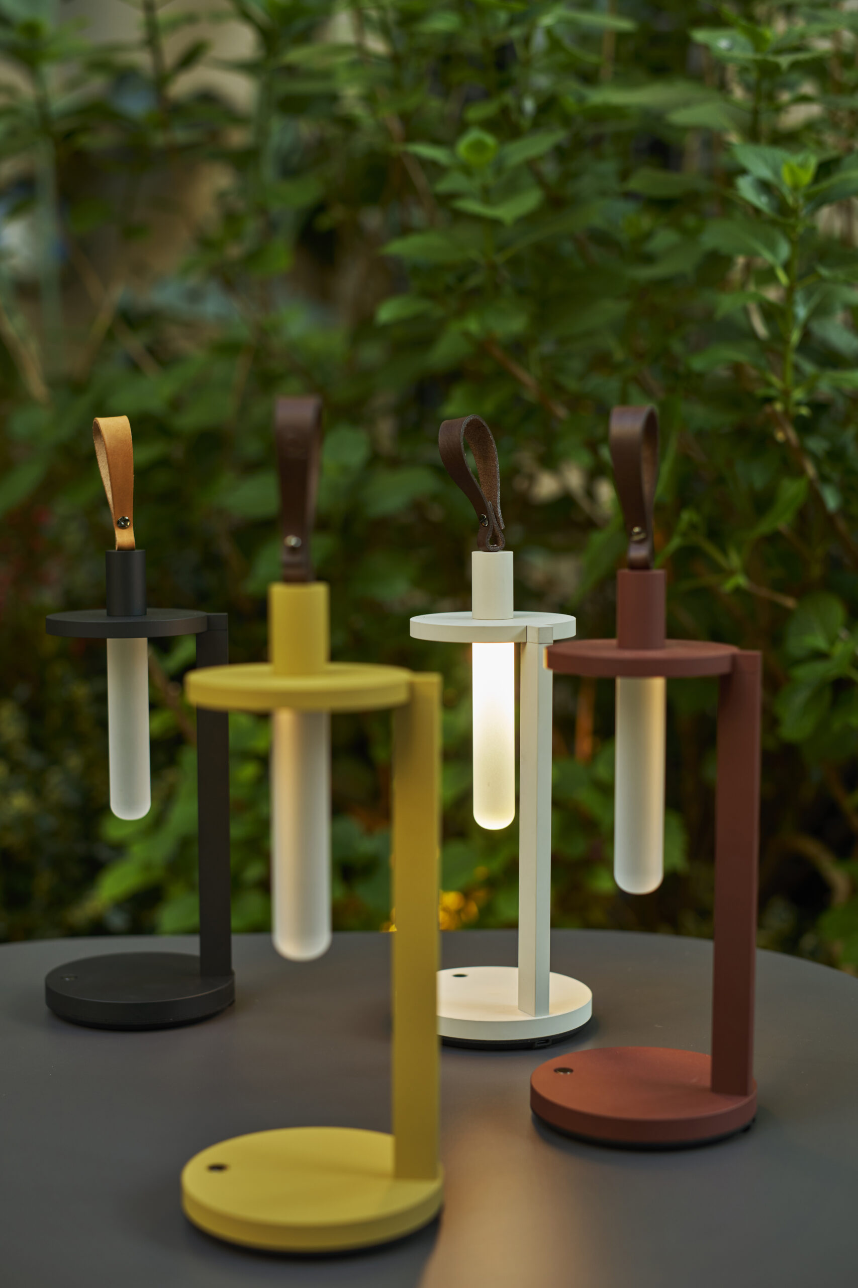 Realizzata con parti meccaniche in alluminio e polimeri tecnici, la lampada Brillina è dotata di un guidaluce in polimetilmetacrilato sabbiato con riflettore a specchio integrato; la fonte luminosa è alimentata da batterie ricaricabili con autonomia di oltre 8 ore e accensione, spegnimento e dimmerazione sono gestiti da un comando touch sulla base. La fibbia in cuoio naturale consente di utilizzare Brillina in modo originale, come appendendola a un ramo o a un gancio da parete. Brillina è stata disegnata da Parisotto + Formenton Architetti ed è proposta da Qu.